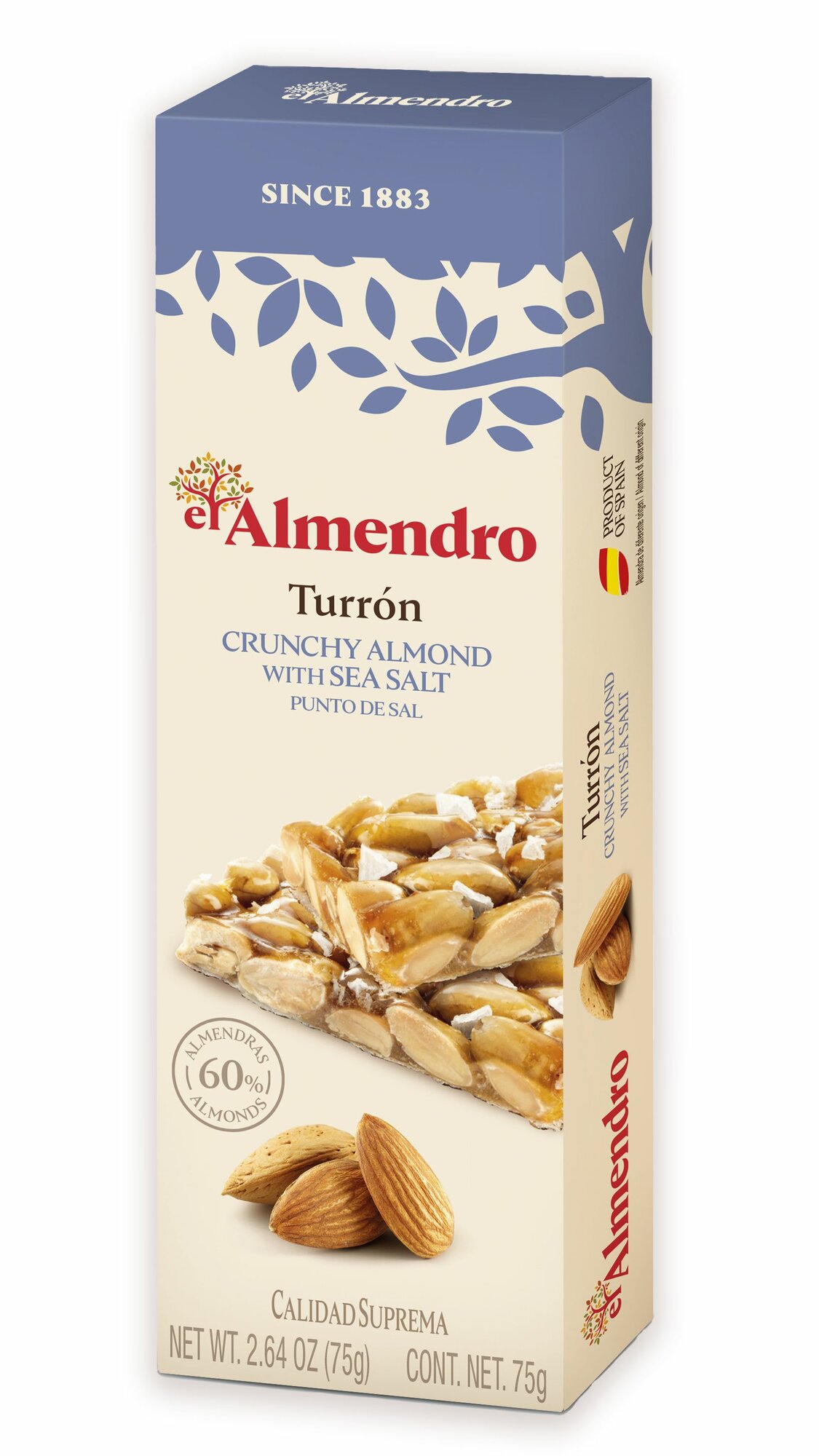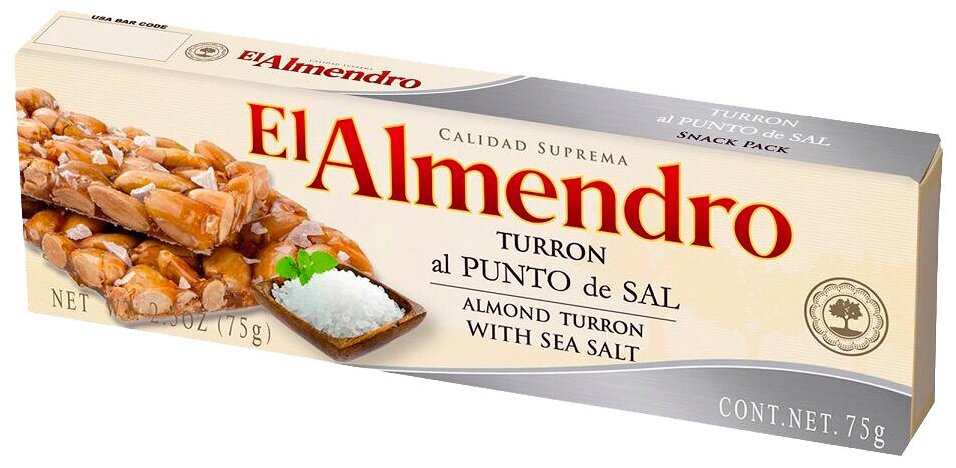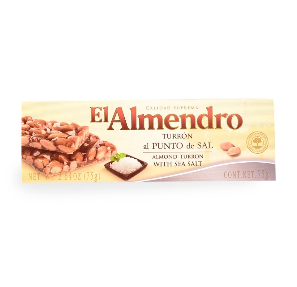 Для производства миндального туррона с морской солью бренда El Almendro используются только натуральные высококачественные ингредиенты. Продукт содержит 60% испанского миндаля сорта Marcona, мед, вафли и яйца. Хрустящий деликатес подают к сладким и игристым винам, а также это прекрасный вариант для питательного завтрака или перекуса к чаю и кофе. Кроме того, туррон можно использовать для приготовления мороженого и различных десертов.