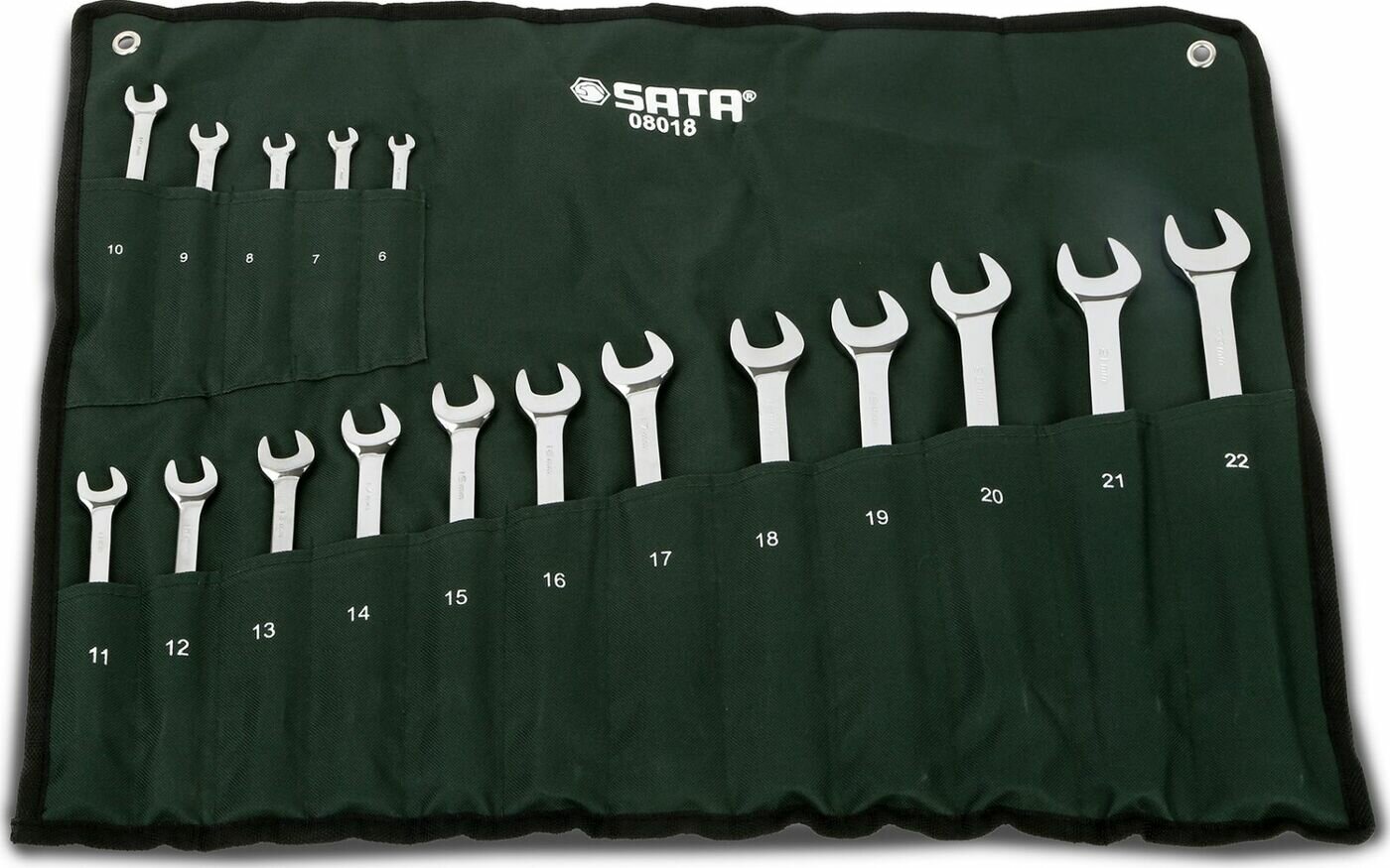 Профессиональный набор ключей Sata из твёрдой инструментальной стали выдержит большую нагрузку во время работы инструмента. Набор ключей 17 предмета включает в себя комбинированные ключи размерами от 6 до 22 мм, с надёжным захватом и высоким классом точности. Ключи размещены в удобном чехле из плотной ткани с ячейками, он надёжно фиксируется это удобно при транспортировке и хранении. Набор ключей благодаря своему качеству стал популярным среди большого числа механиков и автолюбителей.