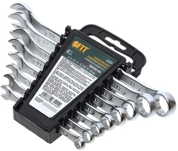 | Прочие особенности и свойства | Набор комбинированных ключей FIT 63424 (8 - 19 мм) 8 шт. ''Хард'', в пластиковом держателе. Материал:хромванадиевая сталь, хромированное покрытие. |