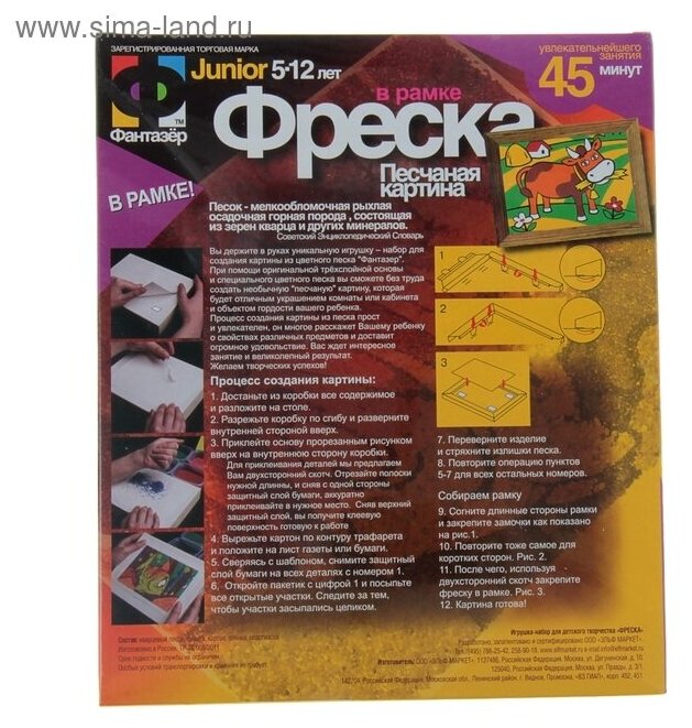 "Уникальная игрушка — набор для создания песчаной картины. При помощи оригинальной трехслойной основы и специального цветного песка вы сможете без труда создать необычную «песчаную» картину, которая станет отличным украшением комнаты или кабинета и объектом гордости для вашего ребенка.Процесс создания прост и увлекателен, он расскажет о свойствах различных материалов и доставит огромное удовольствие. Вас ждет интересное занятие и великолепный результат. Желаем творческих успехов! "