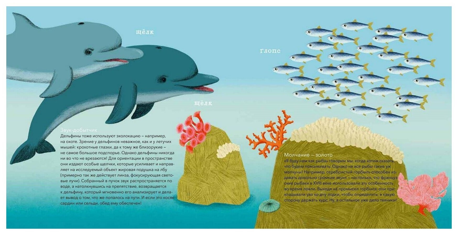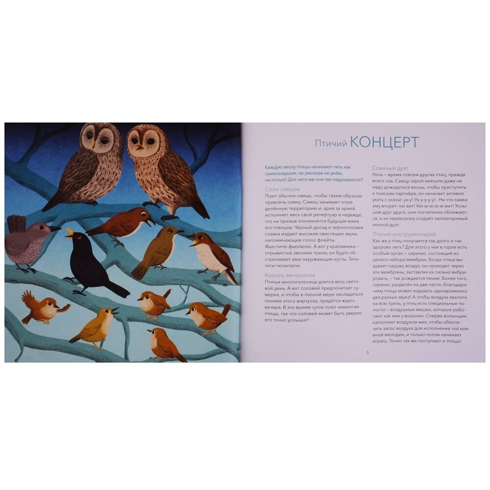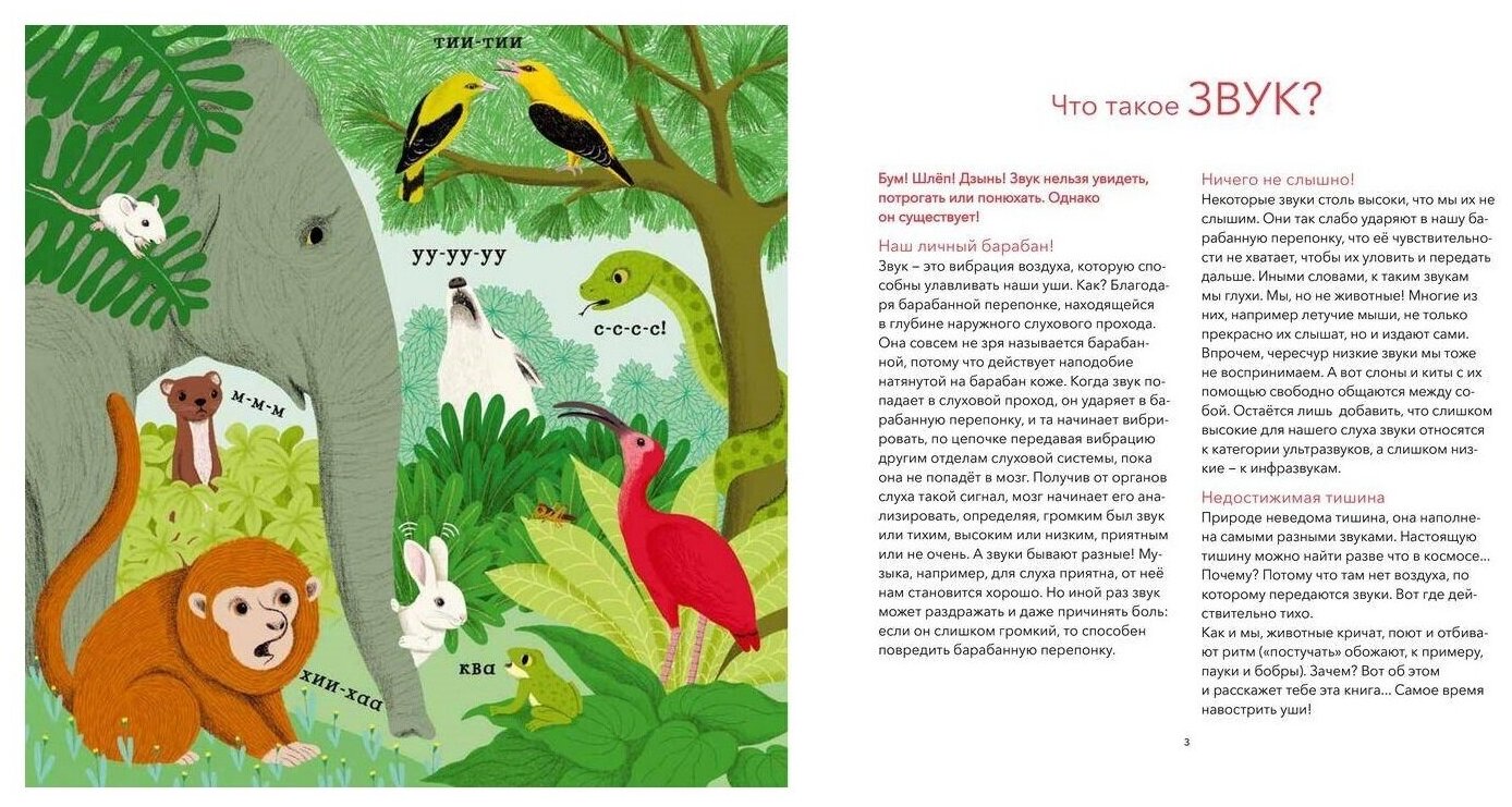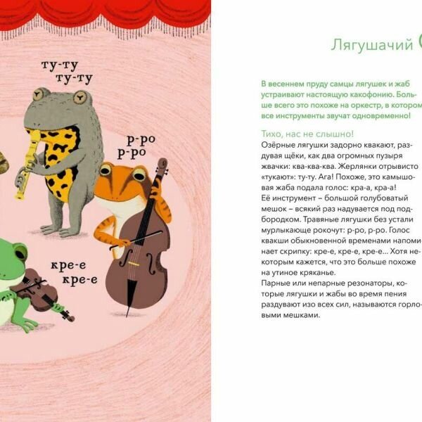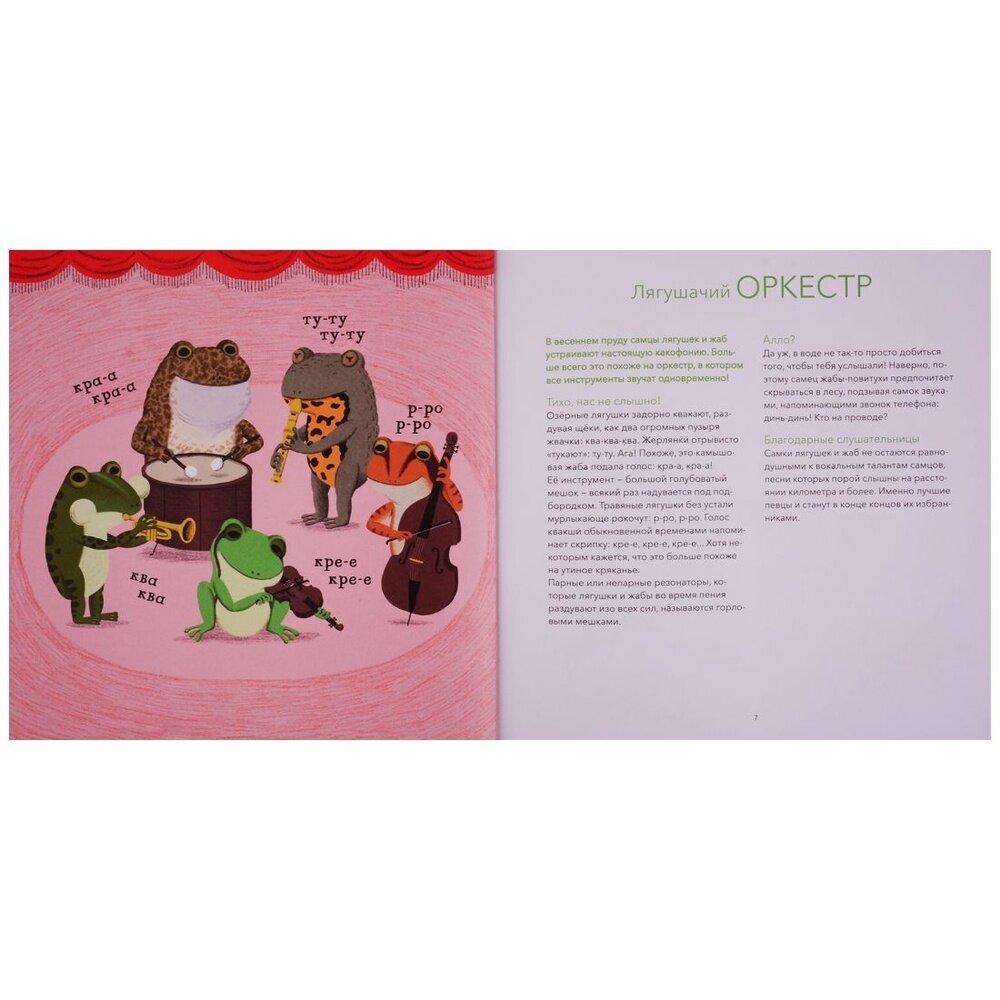 Поговорить любят не только люди. Животные тоже с удовольствием болтают между собой, просто мы не умеем их слушать. А ведь природа полна удивительных исполнителей, причём их концерты звучат не только на суше, но и в воздухе и даже под водой! Слышал ли ты, к примеру, о пауках-гитаристах, поющих мышах или скворцах-имитаторах? А о лающих рыбах? Животные охотно используют звук для общения, но он им нужен не только за этим: ещё он помогает размечать территорию, отгонять хищников или привлекать партнёра в брачный сезон. Эта книга откроет тебе удивительный мир звуков, которыми так богата окружающая нас природа.