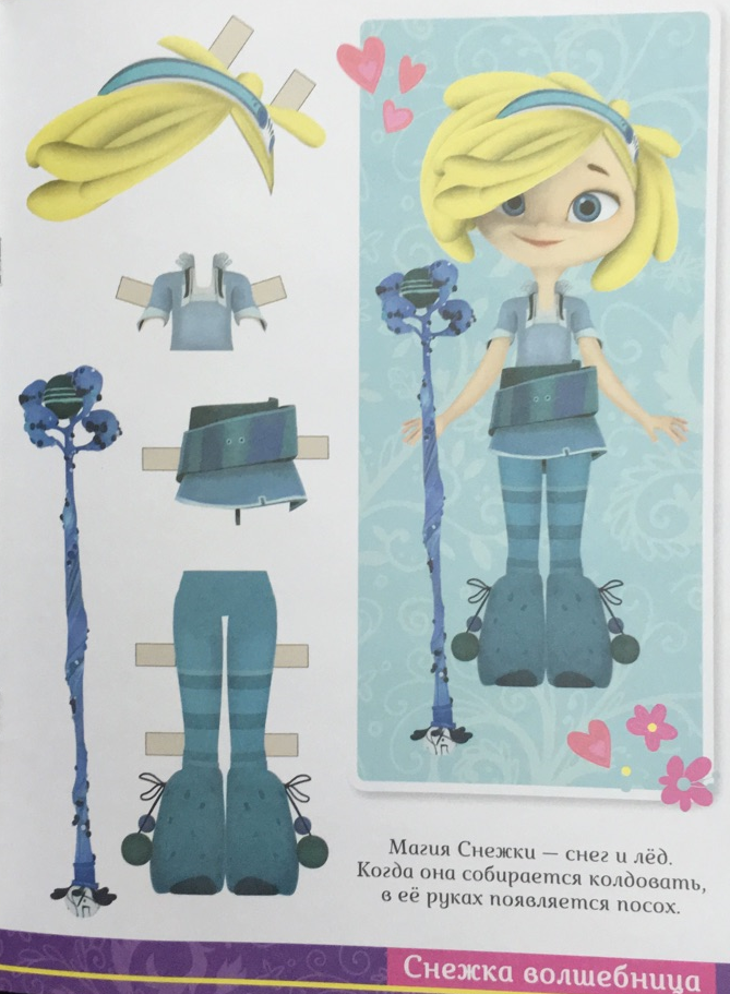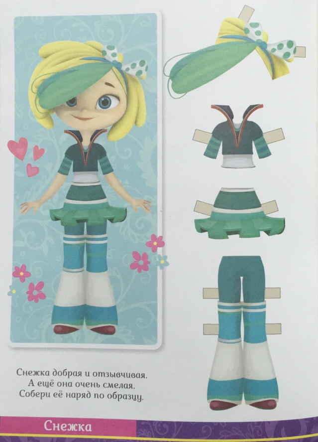 В книге, несмотря на название две куклы - Варя и Снежка, высотой 19 сантиметров, размещены на обратной стороне обложки. В книжке всего 4 листа, для каждой куклы по два комплекта одежды, Кроме наряда образец, как кукла выглядит в нём и немного о характере героини, есть и посох для Снежки, можно менять причёску под наряд. При желании можно нарисовать наряд и самим, как делали мы в детстве.