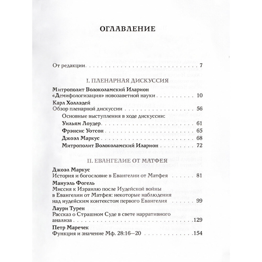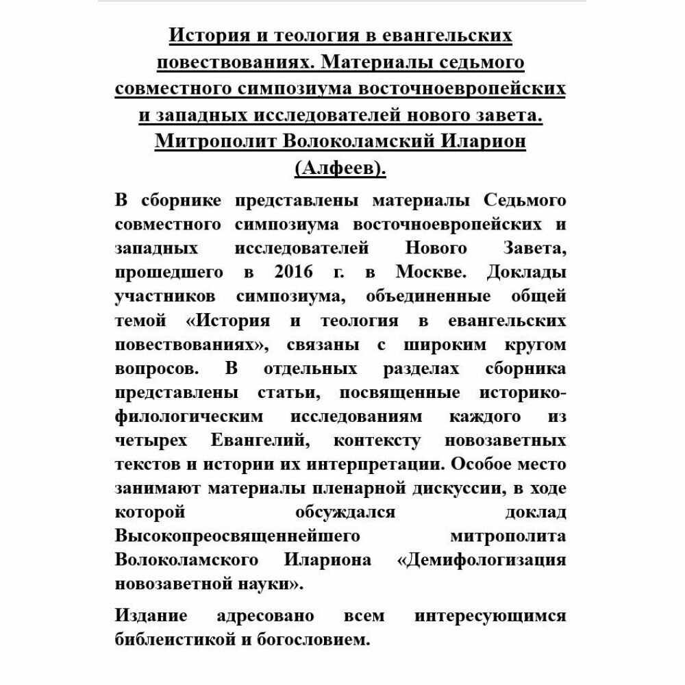В сборнике представлены материалы Седьмого совместного симпозиума восточноевропейских и западных исследователей Нового Завета, прошедшего в 2016 г. в Москве. Доклады участников симпозиума, объединенные общей темой "История и теология в евангельских повествованиях", связаны с широким кругом вопросов. В отдельных разделах сборника представлены статьи, посвященные историко-филологическим исследованиям каждого из четырех Евангелий, контексту новозаветных текстов и истории их интерпретации. Особое место занимают материалы пленарной дискуссии, в ходе которой обсуждался доклад Высокопреосвященнейшего митрополита Волоколамского Илариона "Демифологизация новозаветной науки".