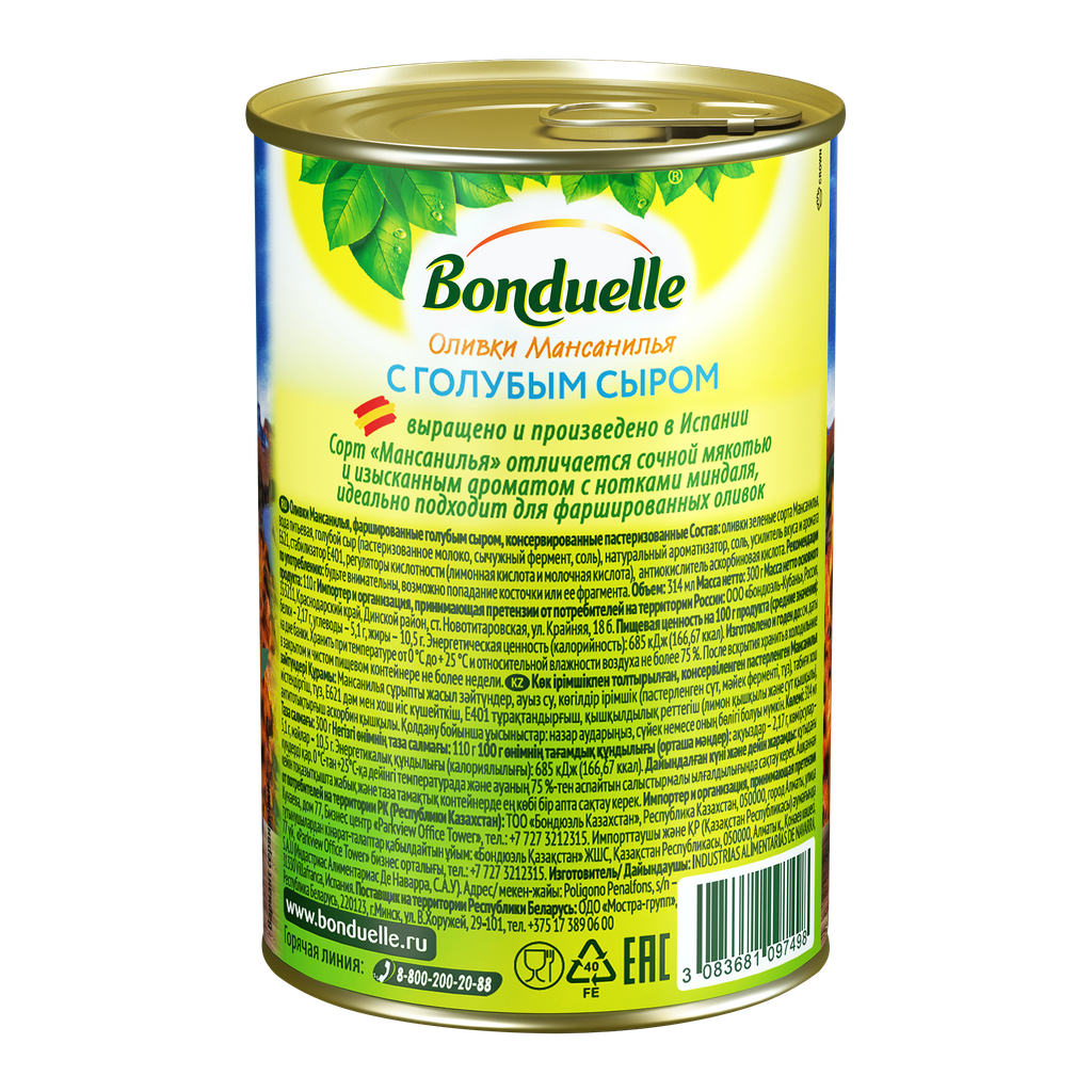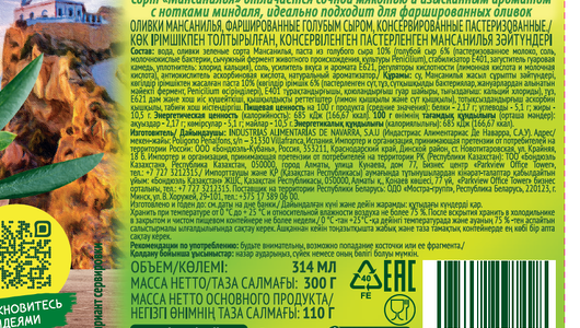 | Состав | оливки зеленые сорта Мансанилья, вода питьевая, голубой сыр (пастеризованное молоко, сычужный фермент, соль), натуральный ароматизатор, соль, усилитель вкуса и аромата Е621, стабилизатор |