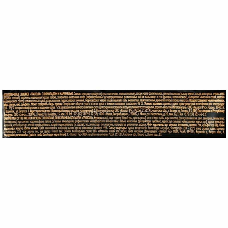 | Состав | зерновые продукты (мука пшеничная, хлопья овсяные); сахар; масло растительное; темный шоколад (какао тертое; сахар; декстроза; эмульгатор |