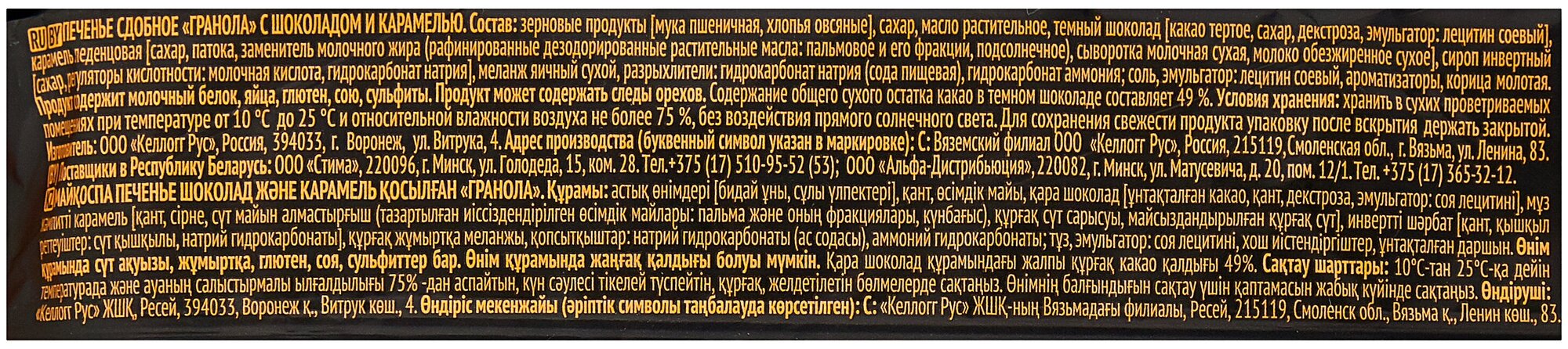Описание товара:Сдобное печенье Kellogg's «Гранола» с шоколадом и карамелью имеет насыщенный аромат, пробуждающий аппетит. Входящие в него запеченные злаки дарят долгое насыщение, поэтому печеньки подходят для вкусного и полезного завтрака или перекуса. Щедрая россыпь шоколада высокого качества придает десерту яркий вкус, а нежная карамель оставляет приятное послевкусие. Хрустящее сдобное печенье Kellogg's «Гранола» с шоколадом и карамелью имеет мягкую начинку и отлично сочетается с напитками.Состав товара:Зерновые продукты [мука пшеничная, хлопья овсяные], сахар, масло растительное, темный шоколад [какао тертое, сахар, декстроза, эмульгатор: лецитин соевый], карамель леденцовая [сахар, патока, заменитель молочного жира (рафинированные дезодорированные растительные масла: пальмовое и его фракции, подсолнечное), сыворотка молочная сухая, молоко обезжиренное сухое], сироп инвертный [сахар, регуляторы кислотности: молочная кислота, гидрокарбонат натрия], меланж яичный сухой, разрыхлители: гидрокарбонат натрия (сода пищевая), гидрокарбонат аммония; соль, эмульгатор: лецитин соевый, ароматизаторы, корица молотая. ТУ 10.72.12-003-59045630-2016.Меры предосторожности:Продукт содержит молочный белок, яйца, глютен, сою, сульфиты. Может содержать следы орехов.