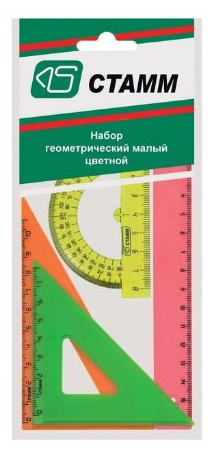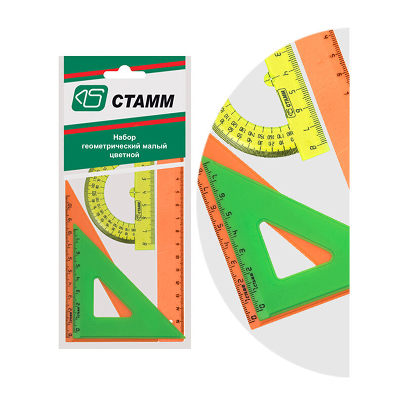 Набор чертёжный малый СТАММ Neon предназначен для выполнения чертёжных и измерительных работ. В набор входят: линейка со шкалой 16 см; треугольник со шкалой 10 см и углом 30°; треугольник со шкалой 7 см и углом 45°; транспортир 180° и шкалой 8 см. Все изделия имеют безопасные закруглённые углы и чёткую шкалу. Набор представлен в неоновых цветах ассорти.