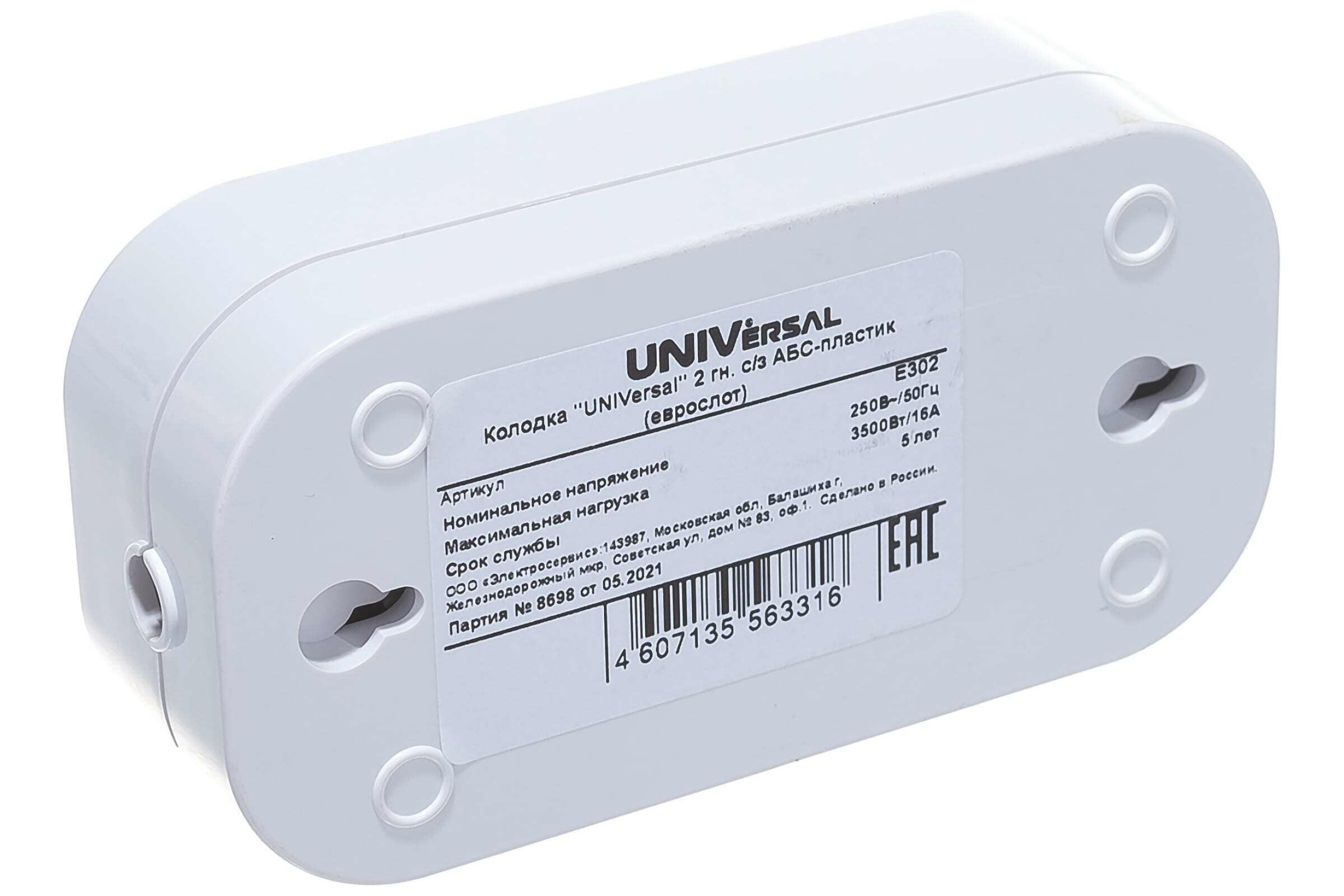 Колодка с заземлением, 2 гнезда, AБС-пластик UNIVersal E302 представляет собой корпус с розетками, оснащенными заземляющими контактами, для подключения одновременно двух электрических приборов к сети переменного тока 220 В. Колодка представляет собой составляющую удлинителя без шнура с вилкой. Изделие широко используется в бытовых условиях внутри помещений.Преимущества Габариты: 118х60х42 мм Диаметр гнезда: 39 мм Компактный корпус из АБС-пластика, не подверженного воздействию коррозии Классический белый цвет корпуса идеально впишется в любой дизайн интерьера Позволяет одновременно подключать к сети 2 источника потребления электроэнергии Изделие произведено согласно стандартам ГОСТ и всем нормативным документам, что обеспечивает прочность, надежность и долговечность Колодка характеризуется минимальными затратами на эксплуатацию, а также легкостью и простотой монтажа к остальной части устройства Заземляющие контакты обеспечивают высокую электробезопасность во время монтажа и эксплуатации колодки 2 гнезда, AБС-пластик UNIVersal E302