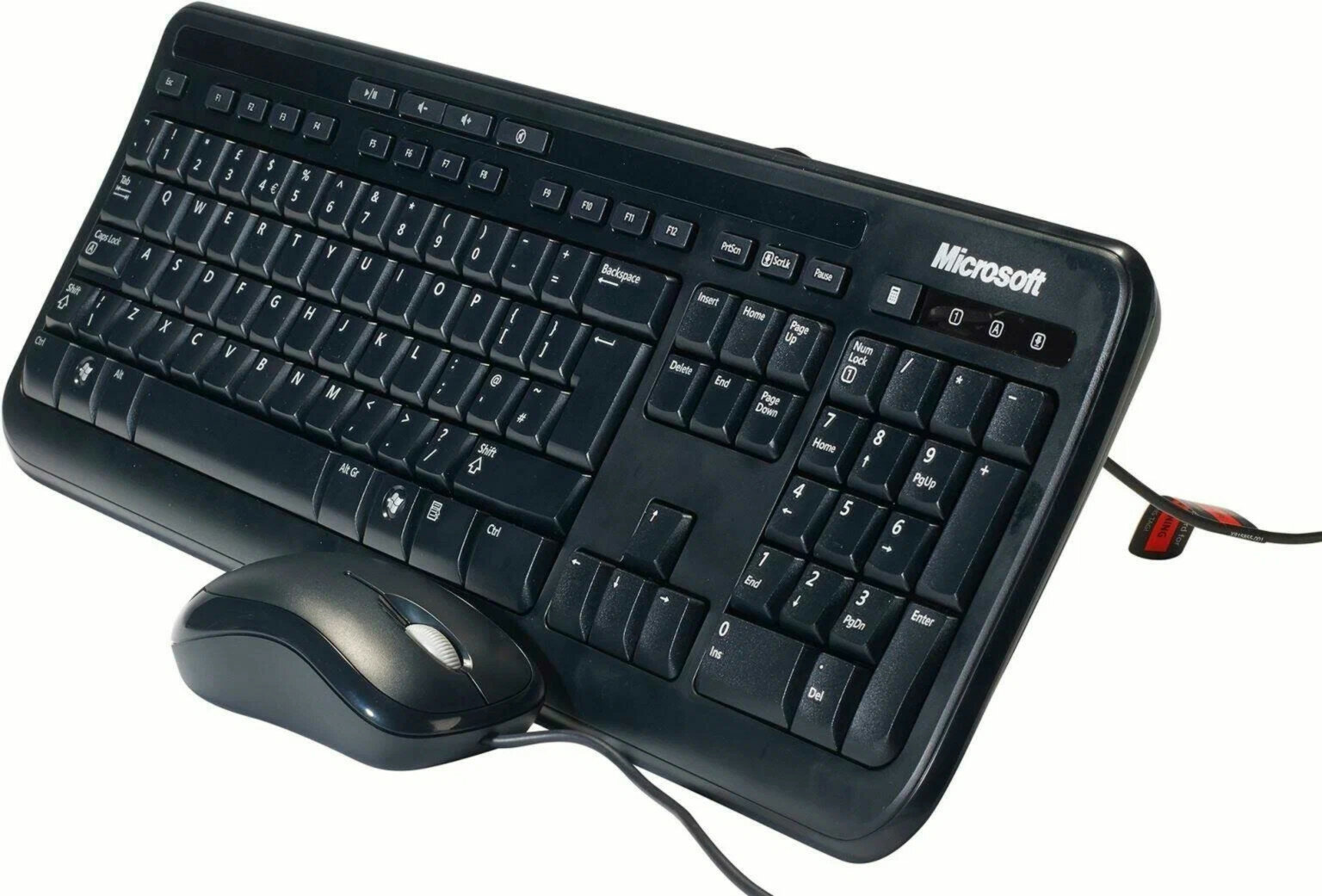 Комплект Microsoft USB. Проводные клавиатура и мышь. Интерфейс USB. Для настольного компьютера. Классическая клавиатура. Клавиш: 109, дополнительных: 5. Светодиодная мышь, 3 клавиши. Разрешение сенсора мыши 800 dpi.