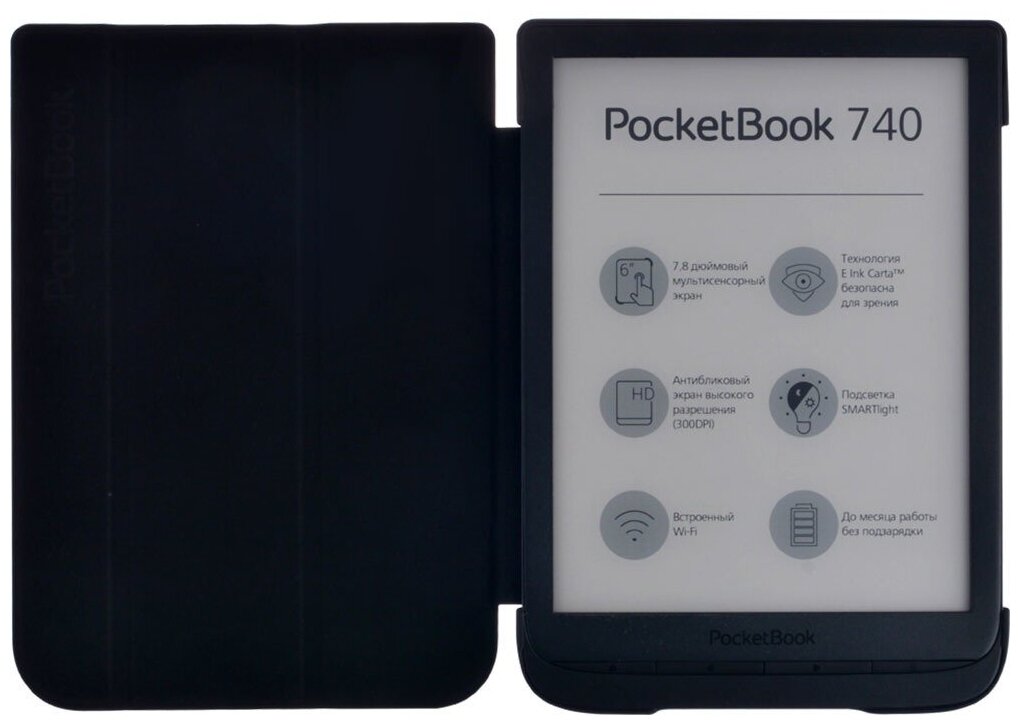 Чехол-книжка для PocketBook 740 с покрытием Soft-Touch. Чехол легко превращается в подставку, обеспечивая оптимальные условия для чтения книг под комфортным для этого углом. Кейс-бампер имеет покрытие Soft-Touch.Ридер прочно фиксируется внутри пластикового кейса-бампера.