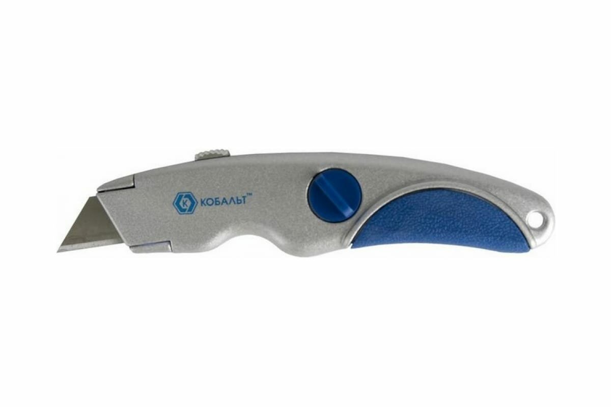 Нож технический Кобальт , трапециевидные лезвия 19 мм, металлический корпус - предназначен для резки обоев, линолеума, картона, бумаги, пленки, резины, пробки, пластика и других мягких листовых материалов.Преимущества Металлический корпус, прорезиненная рукоятка Лезвия изготовлены из высокоуглеродистой инструментальной стали У8 с закалкой до твердости 59 HRC В корпусе предусмотрено отверстие для крепления шнура Ползунковый механизм с автоматической фиксацией лезвия для быстроты и удобства работы В комплекте 3 двусторонних трапециевидных лезвия размещенных в корпусе ножа