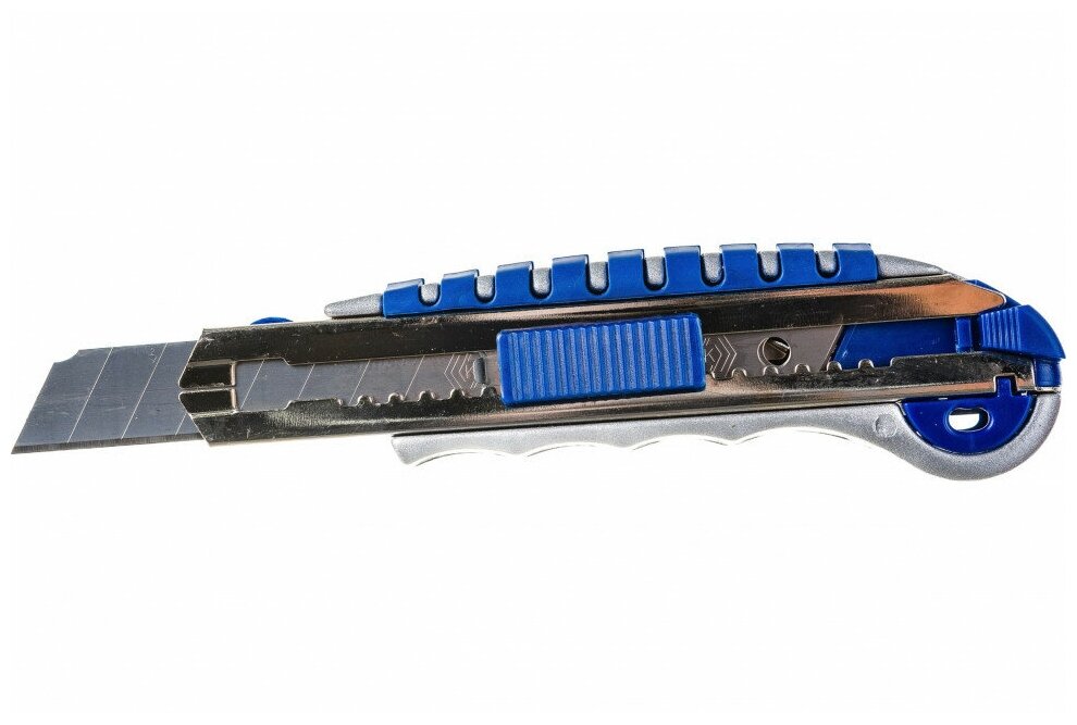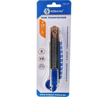 Технический нож, лезвия 18мм 6шт, металлический корпус, автостоп, доп. фиксатор кобальт способствует быстрому и легкому резу тонких материалов из неплотной текстуры, например: бумаги, картона, обоев, линолеума, резины, пластика и т. д. Изделие имеет несколько удобных функций - автостоп и быструю смену лезвий, а также дополнительно оснащено фиксатором лезвия. Ручка ножа выполнена из металла с прорезиненными вставками.