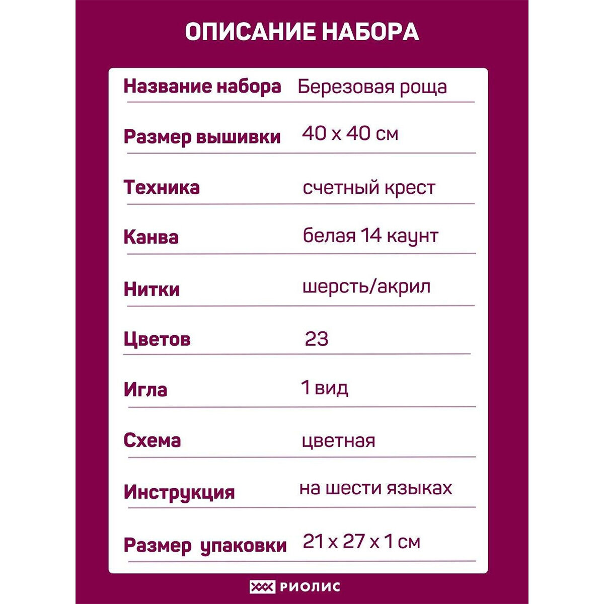 На сегодняшний день товар «1436 "Березовая роща" Риолис (Сотвори Сама) (размер: 40х40)» можно купить с кешбеком в 1 магазине: Яндекс.Маркет