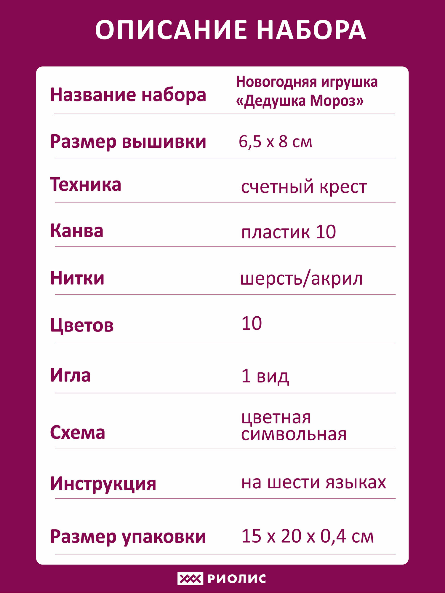 Продажа от производителя! В состав комплекта входит пластиковая канва без нанесённого рисунка 10 каунта, нитки шерсть/акрил 10 оттенков, а также простая для понимания цветная символьная схема и качественная игла. Габариты готовой работы 6,5х8 см. В наборе используются техники счетный крест, стежок. Прилагается игла для вышивания крестиком нужного размера, чтобы обеспечить легкость и точность шитья. Благодаря подробной схеме и приложенной инструкции работа с картиной будет лёгкой и приятной! Набор подходит для праздничных поводов, таких как День рождения, Рождество, Новый год. Оформленная игрушка послужит прекрасным украшением или презентом для мамы или бабушки. Продукция бренда риолис - оптимальное решение для тех, кто ищет изделие высокого качества, любит творчество и хочет попробовать себя. В нашем ассортименте найдутся варианты на любой вкус, как для опытных искусниц, так и для начинающих вышивальщиц, для детей и взрослых. От маленьких уникальных сюжетов до больших картин и репродукций. Риолис - ваш идеальный выбор!