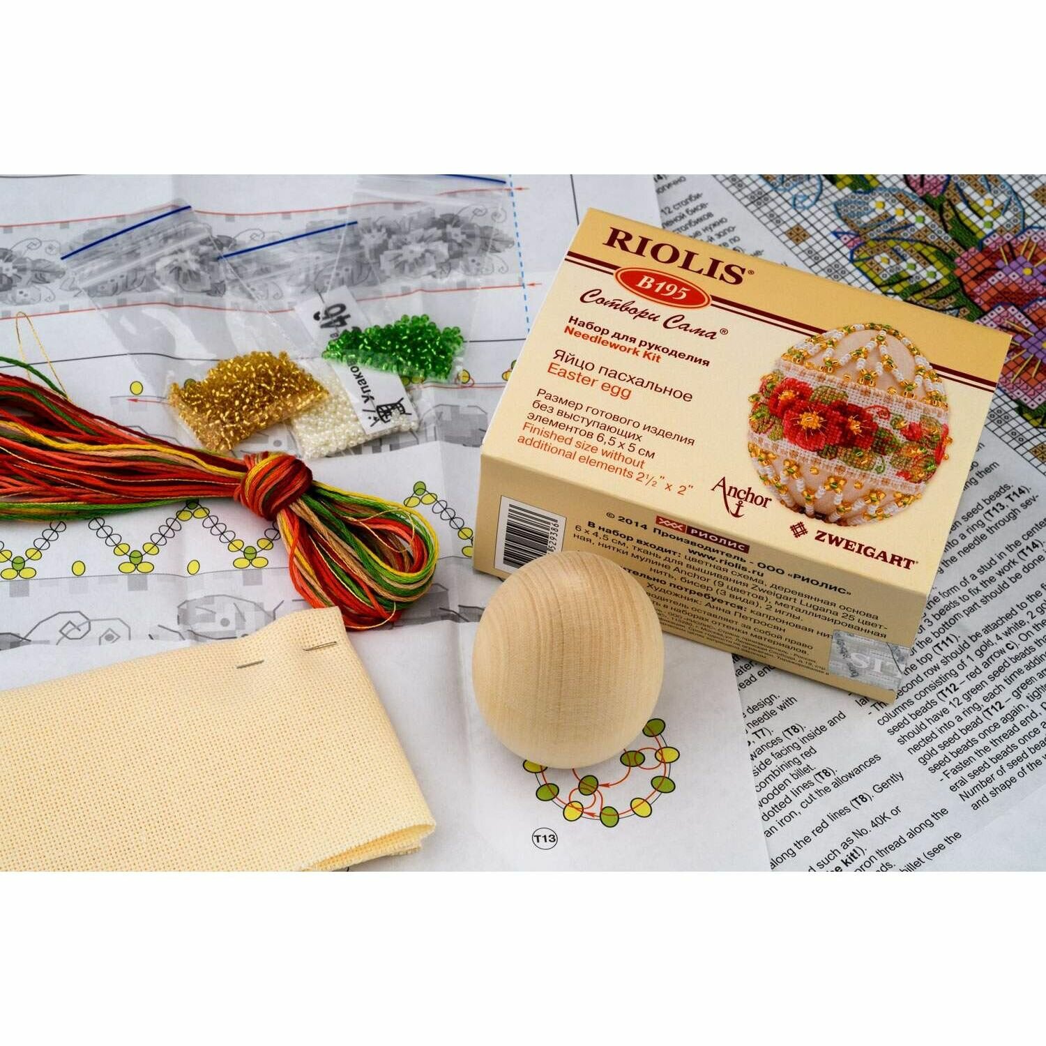 В комплекте: канва цветная, деревянная основа 6х4,5 см., нитки мулине Anchor, металлизированная нить, набор бисера, 2 иглы, цветная схема, руководство по работе.