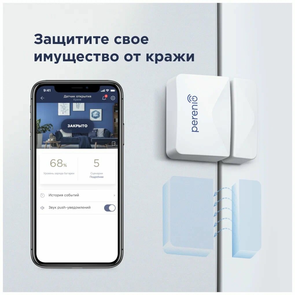 | Прочие особенности | Беспроводной датчик открытия Perenio PECWS01, , Наш надежный беспроводной датчик открытия для двери и окна отличается стильным и функциональным дизайном. Прибор состоит из двух частей, связанных магнитным полем. При удалении одной части от другой более, чем на 20-30 мм, в центр управления отправляется сигнал., , Радиус подключения к центру управления системой составляет до 40 метров. Это позволяет использовать датчик на значительных площадях – в загородных домах, коттеджах, на складах, в магазинах., , Прибор полностью совместим с системами IOS и Android, поэтому вы можете легко управлять им при помощи смартфона и нашего приложения Perenio Smart: Система Управления Зданием., , Эконочичная работа устройства позволяем ему функционировать до двух лет на одной литиевой батарейке., , Ударопрочный, немаркий материал корпуса и приятный внешний вид позволяют датчику удачно вписываться в любой интерьер, а малый вес и скромные габариты делают его практически незаметным., , Как работает датчик движения?, Например, если вы установили датчик на дверь, то при ее открытии, на Ваш телефон мгновенно придет уведомление (если помещение находится в режиме охраны), а также статус датчика в приложении изменится на "Открыто"., , Как установить?, 1. Распаковать, подключить к Центру управления PEACG01 в приложении Perenio Smart согласно инструкции., 2. Не требует специальной установки, имеет компактные габариты и поэтому его легко закрепить на окно/дверь с помощью ленты 3М или шурупа, поставляемые в комплекте., Важно! Для работы требуется Центр управления Perenio PEACG01., , Стандарт связи - ZigBee 3.0 (IEEE 802.15.4), Радиус подключения - до 40 м (на открытых участках), Расстояние между датчиком и магнитом (срабатывание), не менее, ?25±5 мм, Кнопка сброса - На боковой панели датчика, Установка:, Для установки внутри помещения, Край дверного/оконного проема (лента 3М), Цвет - Белый, Источник питания - Элемент питания CR2032 (125 мА·ч, 3 В) 1шт., Продолжительность работы от одного элемента питания, до 24 мес., , Рабочая температура - от 0°C до +45°C, Рабочая влажность - от 10% до 85% (без образования конденсата) |