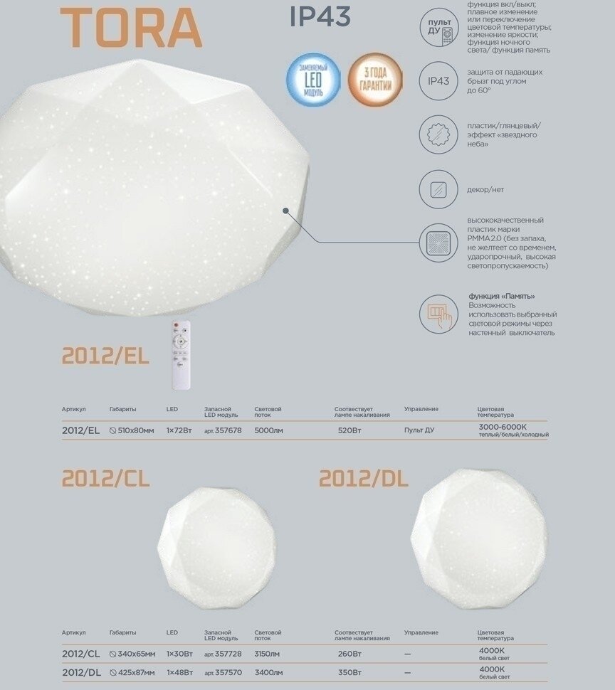 Для изготовления плафонов серии Tora используется современный полиметилметакрилат. Прочный пластик, похожий на матовое стекло, придает светильникам элегантный вид, пропускает до 92% света.