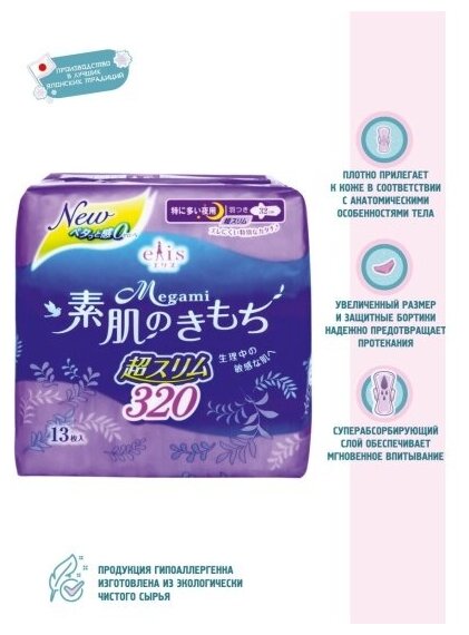 Elis Megami для деликатной защиты чувствительной кожи при особо обильных выделениях: мягкая поверхность и края прокладки - отсутствие раздражений; особый рельеф внутренней поверхности - меньше контакта с кожей, больше комфорта; суперабсорбирующий слой - эффективное впитывание и удержание влаги внутри; дышащий материал – ощущение свежести.