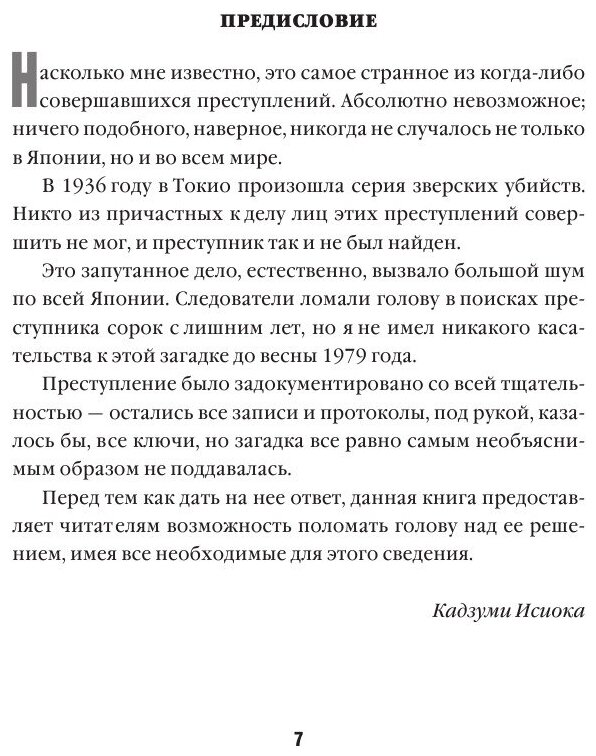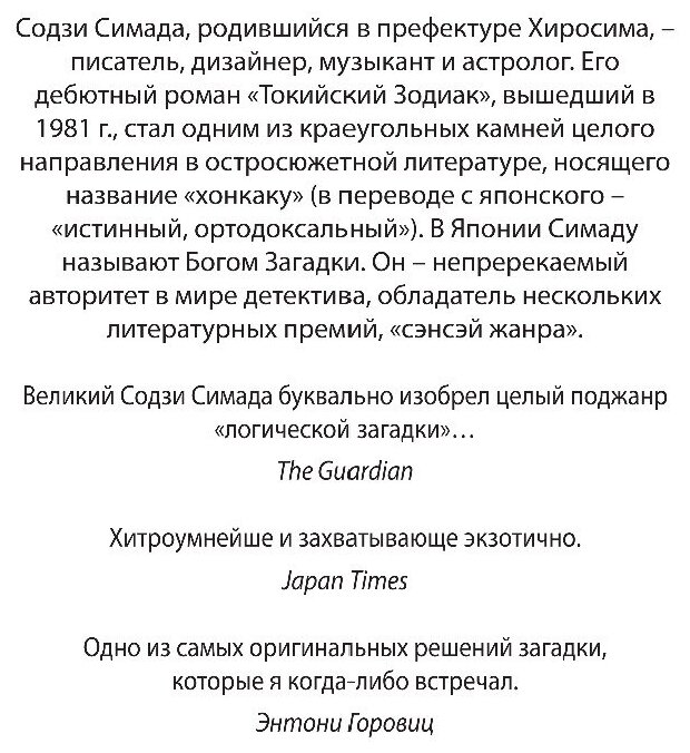 "Бог Загадки" - так называют Симаду Содзи в Японии. Это он создал хонкаку-детектив - новый жанр, столь популярный в Стране Восходящего Солнца. Детектив, в котором читателю предложена честная интеллектуальная игра: раскрыть дело раньше, чем это сделает главный герой. Содзи первым объединил европейскую классику с японской экзотикой, рационализм с мистицизмом. Его великий сыщик - не просто человек острого ума и блестящих аналитических способностей, как Шерлок Холмс, Эркюль Пуаро и Ниро Вульф, но астролог и предсказатель судьбы. Роман Содзи относится к категории "must read" для каждого уважающего себя японофила - он буквально пропитан интересной информацией об истории, культуре и географии Японии предвоенного периода. Перевод с японского языка. "Насколько мне известно, это самое странное из когда- либо совершавшихся преступлений. Абсолютно невозможное; ничего подобного, наверное, никогда не случалось не только в Японии, но и во всем мире. Оно было задокументировано со всей тщательностью - остались все записи и протоколы, под рукой, казалось бы, все ключи. Но загадка все равно самым необъяснимым образом не поддавалась. Перед тем как дать на нее ответ, данная книга предоставляет читателям возможность самим додуматься до решения, имея все необходимые для этого сведения". - Кадзуми Исиока, друг и соратник Киёси Митараи - предсказателя судьбы, астролога и великого детектива. "Великий Содзи Симада буквально изобрел целый поджанр "логической загадки"". The Guardian "Хитроумнейше и захватывающе экзотично". Japan Times "Одно из самых оригинальных решений загадки, которые я когда-либо встречал". Энтони Горовиц