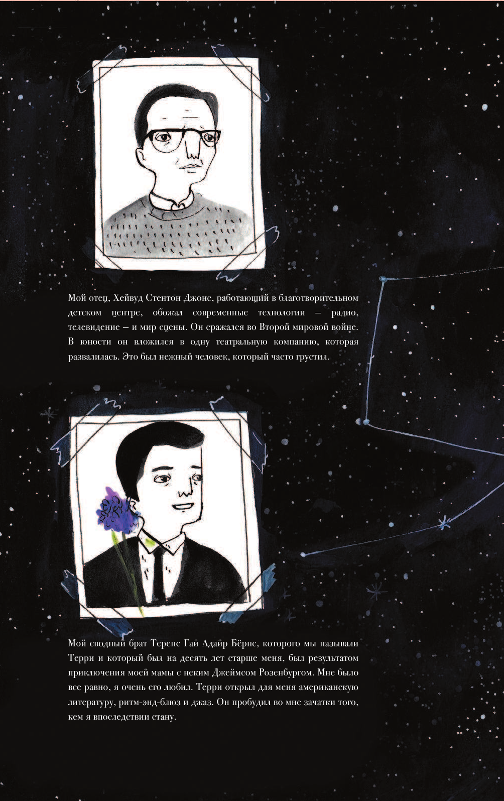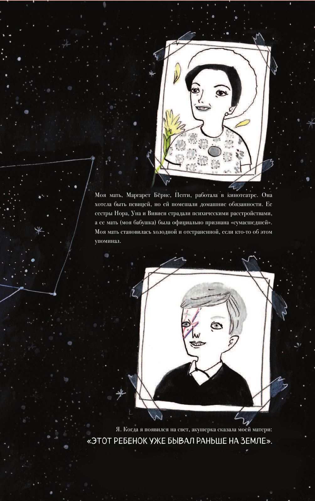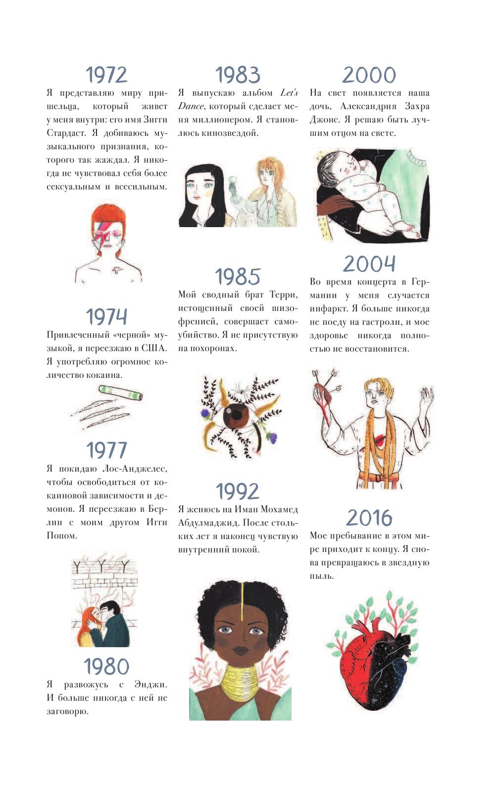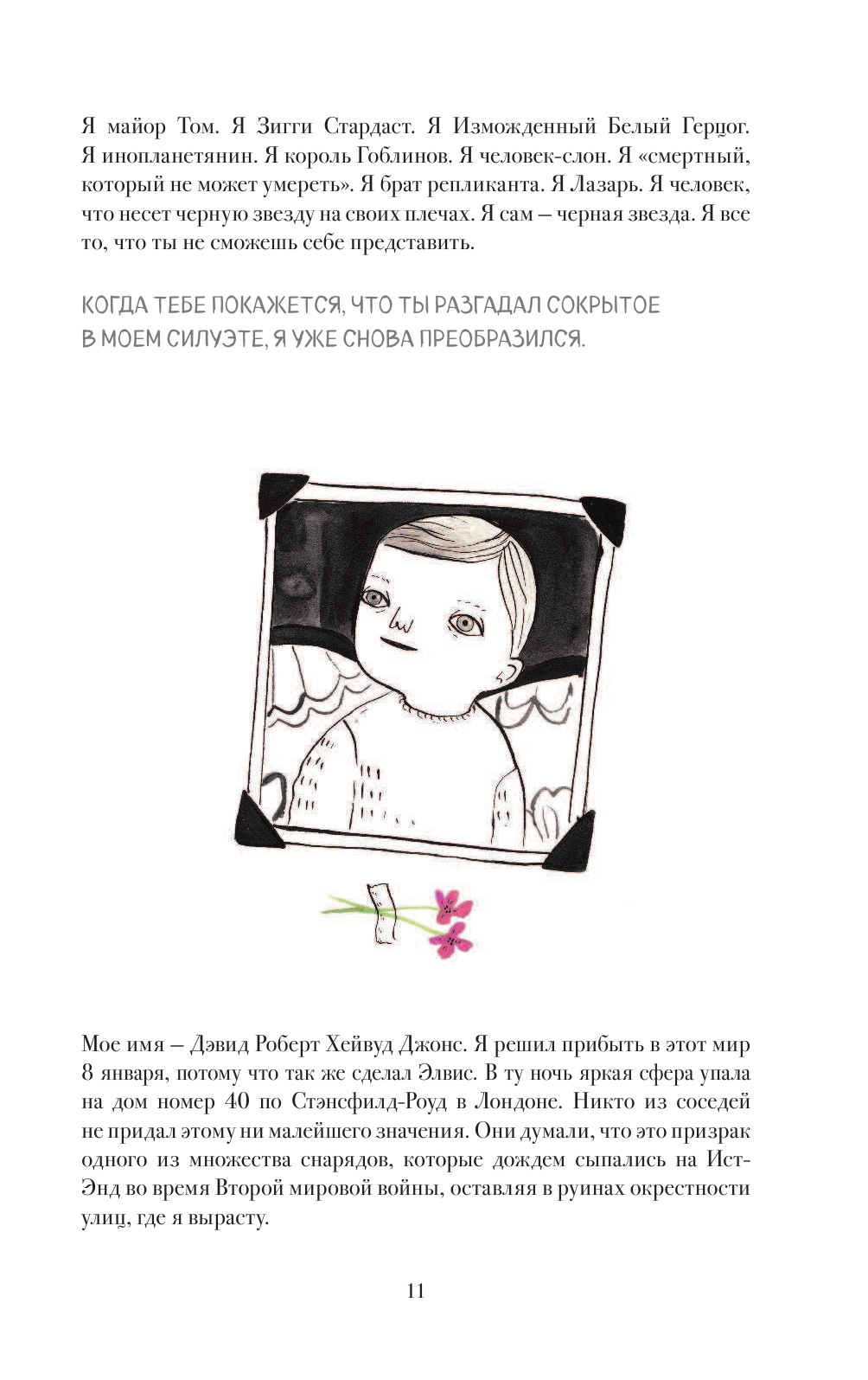 Замечательная книга о фантастическом Дэвиде Боуи. Рекомендовала бы в качестве подарка поклонникам музыканта. А вот для первого знакомства с Дэвидом, если хотите разобрать биографию и узнать хоть что-то, пожалуй, не стала бы советовать. Фантазии и домыслы переплетены с реальными фактами, и местами будет сложно отделить одно от другого. В этом же и плюс книги, но только для "знакомых" с жизнью мистера Боуи. Еще один плюс, это шикарное качество издания: иллюстрации, оформление страниц, бумага.
