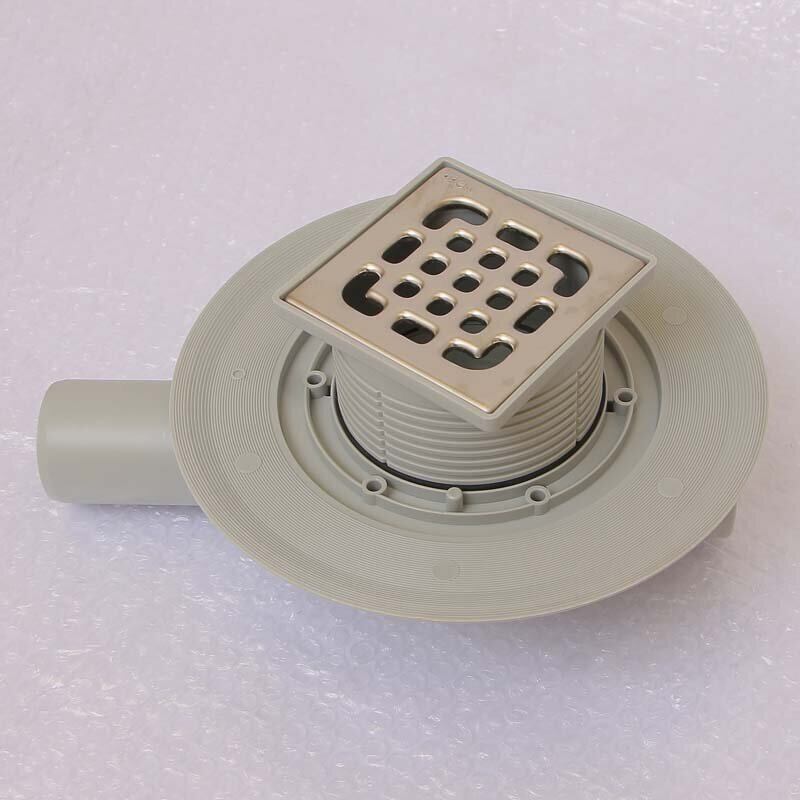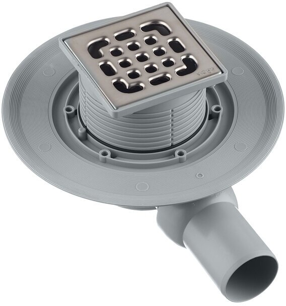 Комплектация: поворотный и регулируемый по высоте надставной элемент 100x100 мм, рамка для установки решетки сделана из пластика, заглушка, штампованная решетка из нержавеющей стали 1.4301, фланец для нанесения/закрепления гидроизоляции, съемное устройство для защиты от неприятного запаха из системы канализации, ввод для подключения дополнительных сантехприборов DN40, выпуск на шарнирном соединении.