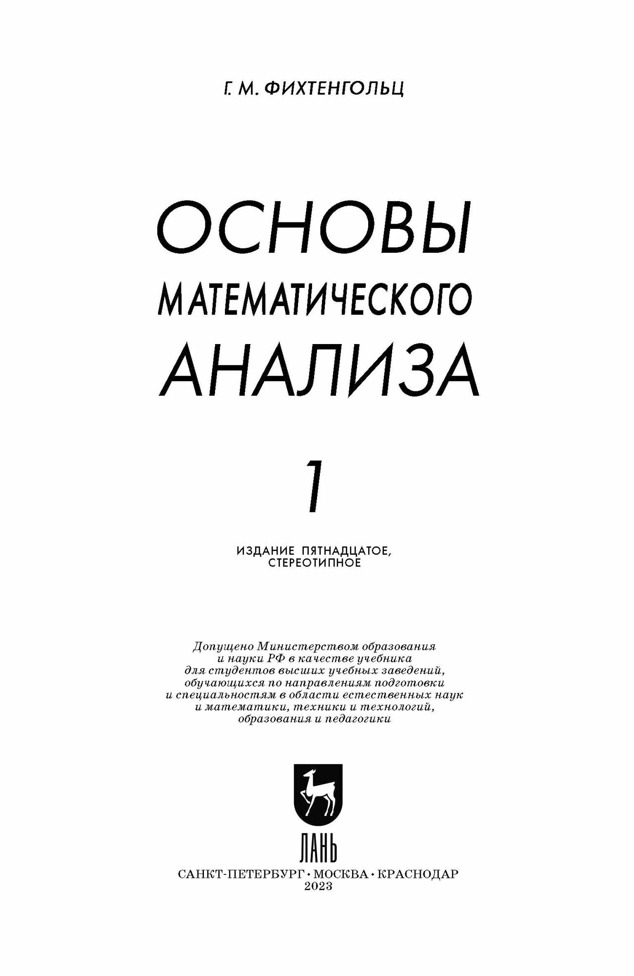 Основы математического анализа. Учебник в 2-х томах. Том 1 (Фихтенгольц Григорий Михайлович); Лань, 2023