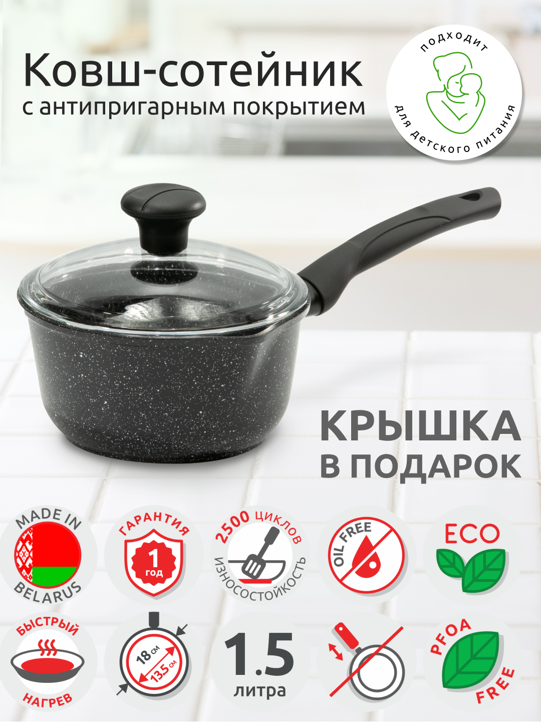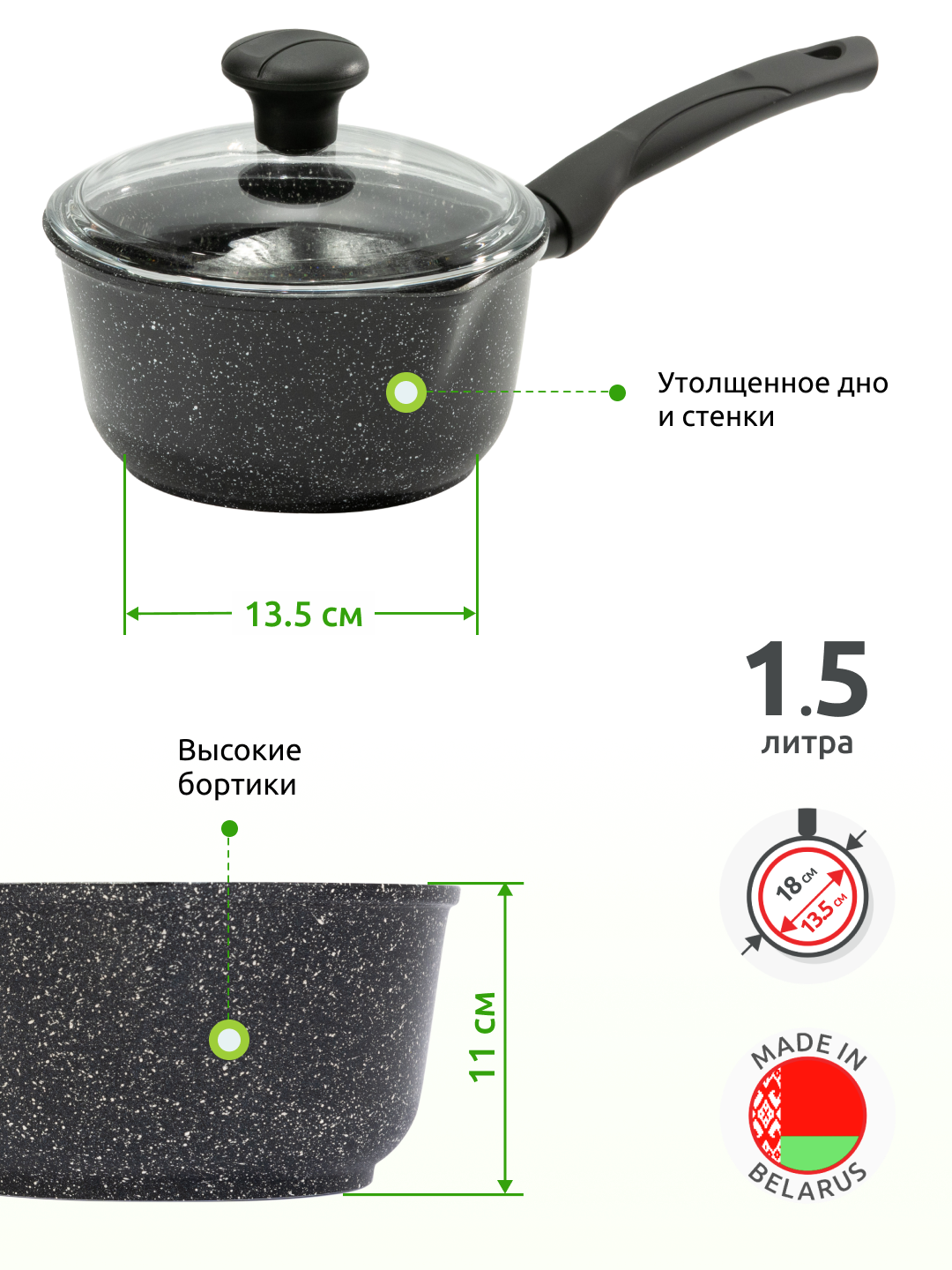 Объем: 1.5 л. Диаметр: 16 см. Диаметр дна: 11 см. Высота: 10 см. Ковш отлично подойдет для таких задач, как приготовление еды на одну порцию или же для приготовления детского питания. Малые габариты и вес ковша Гранит позволят сэкономить пространство на плите и не потребуют лишних усилий при готовке. Литой толстостенный корпус обеспечит равномерное нагревание и гарантирует долговечность посуде. Ковш из литого высококачественного пищевого алюминия станет незаменимым инструментом и надежным помощником на вашей кухне. Сверхпрочное антипригарное покрытие отличается особой износостойкостью и превосходными антипригарными свойствами, рассчитано на интенсивное использование в течении длительного срока. Толщина покрытия до 50 мкр. Позволяет готовить с минимальным количеством масла, сохраняя вкусовые и полезные свойства продуктов. Гарантия 1 год.