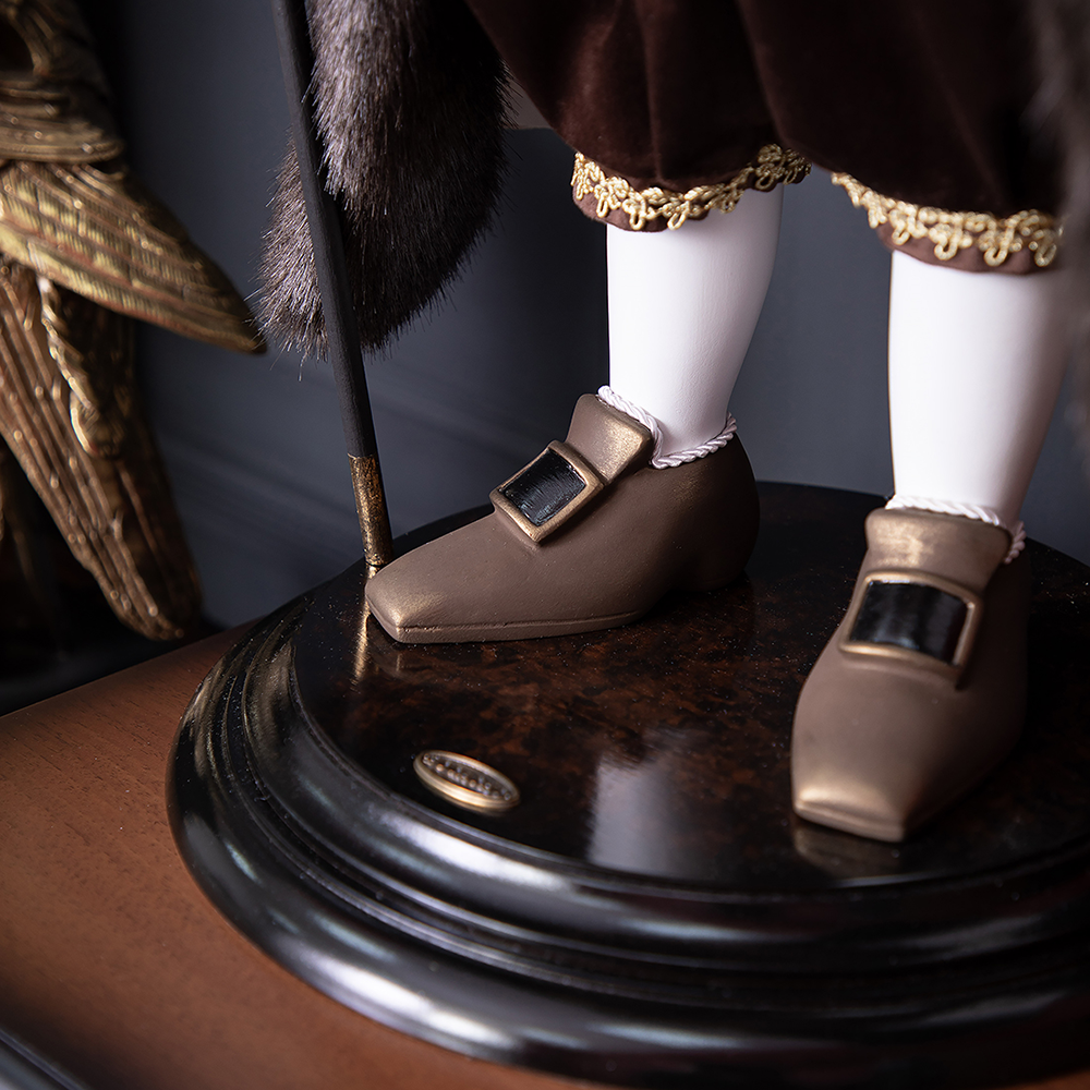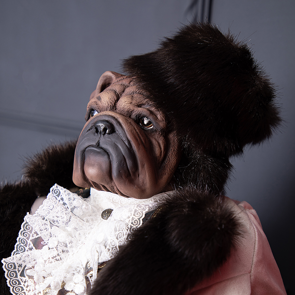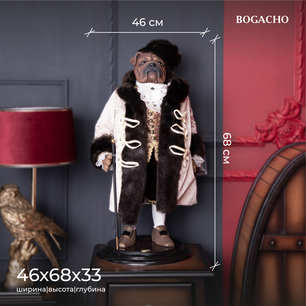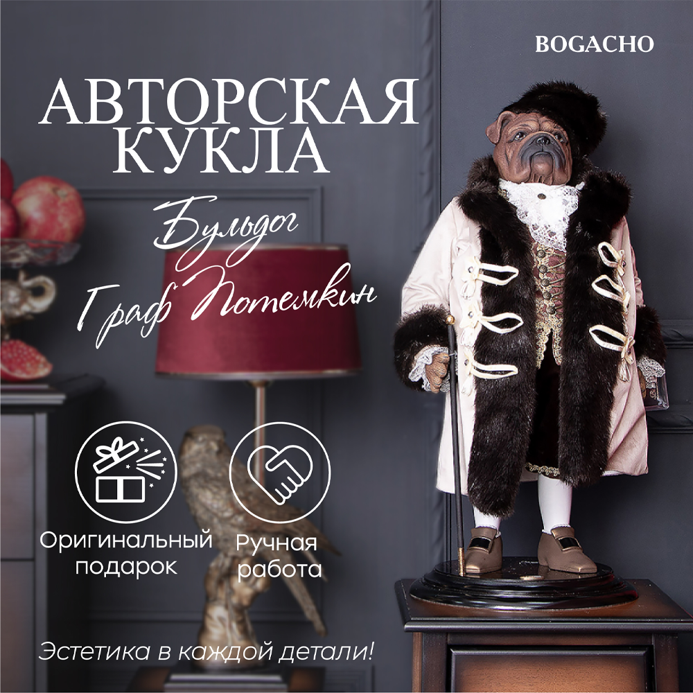 Прототипом коллекционной куклы Бульдог Граф Потёмкин является русский государственный деятель, создатель Черноморского военного флота и его первый главноначальствующий, генерал-фельдмаршал Григорий Александрович Потёмкин. Материалы изготовления и размеры изделияКукла выполнена на основе металлокаркаса, что обеспечивает изделию стойкость. Для придания кукле формы используют синтепон. Голова, руки и ноги изготавливаются из высококачественного коелгинского мрамора, который привозится в виде мраморной крошки, затем отливается в формы и раскрашивается акриловыми красками вручную. Максимальный тираж - 500 шт.