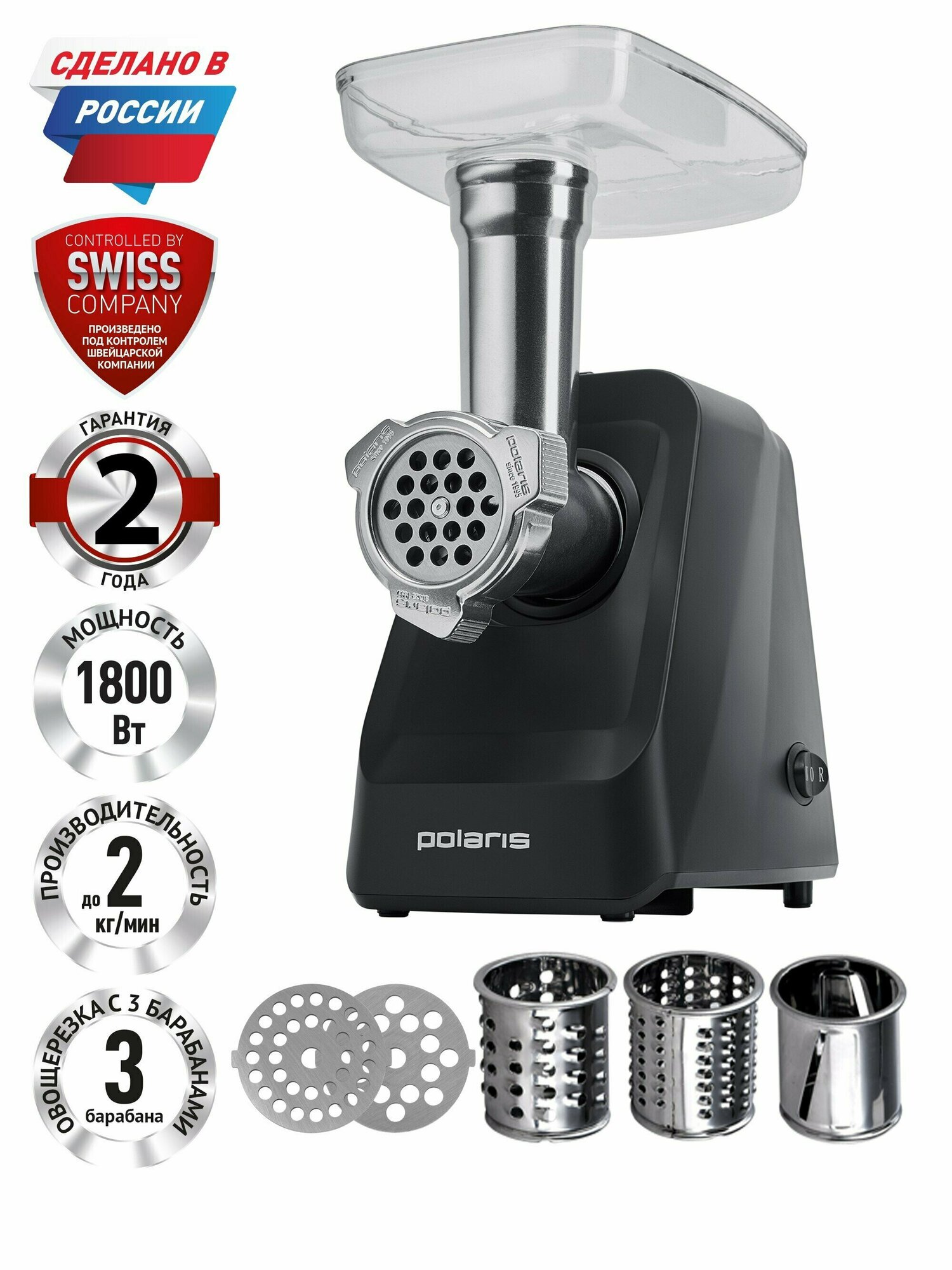 Техника для дома Polaris PMG 1855 Мясорубка Polaris PMG 1855 - универсальная кухонная помощница. Благодаря современному функционалу будущая хозяйка не только сможет расширить домашнее меню, но и существенно сэкономить время на приготовление блюд. Мощности устройства хватает, чтобы перерабатывать до 2 кг мяса в минуту. Функция «реверс» в случае необходимости освободит шнек от тех частей продуктов, которые привели к «засорению» мясорубки, а входящие в комплект терки помогут быстро нарезать овощи.