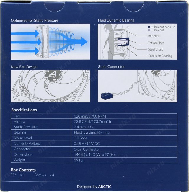 Вентилятор Arctic Cooling P14 [ACFAN00123A] обеспечит эффективную циркуляцию воздуха и охлаждение компонентов системного блока. Используемый в основе модуля гидродинамический подшипник отличается не только низким уровнем шума, но и большим запасом прочности, что может обеспечить до 50000 часов безотказной работы. Для забора воздуха используется 5-лепестковая конструкция нестандартной геометрии, за счет чего обеспечивается эффективная работа с высоким статическим давлением. Скорость вращения данного вентилятора фиксирована и составляет 1700 оборотов в минуту, что обеспечивает мощность направленного воздушного потока до 72.8 CFM. Уровень шума при работе может варьироваться от 22.5 дБ до 24.5 дБ. Вентилятор Arctic Cooling P14 [ACFAN00123A] выполнен в черном пластиковом корпусе толщиной 27 мм и размером 140x140 мм. Минимальное напряжение составляет 2.1 В, максимальное рабочее достигает 12 В. Подключение элемента охлаждения отличается простотой благодаря кабелю длиной 400 мм с коннектором 3 pin типа Male-Female на конце и наличию комплектных винтовых креплений.