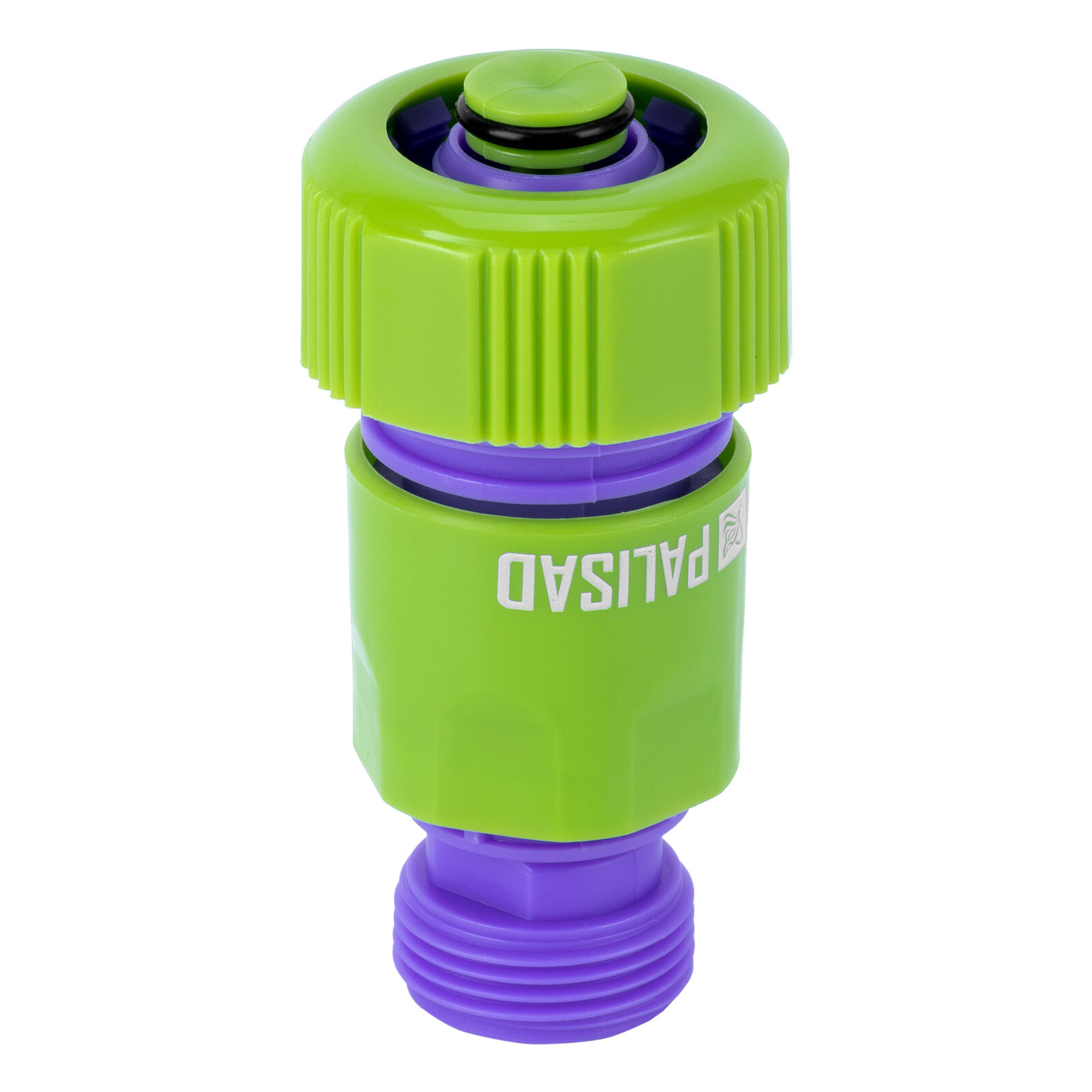 Пластмассовый соединитель-адаптер Palisad с внешней резьбой 3/4 дюйма соединяет источник водоснабжения, имеющий выход с внутренней резьбой соответствующего диаметра, и шланг диаметром 3/4 дюйма. Имеет штуцер быстроразъемного соединения, что упрощает монтаж поливочной линии. Комплект пригодится для организации системы орошения на дачном участке.