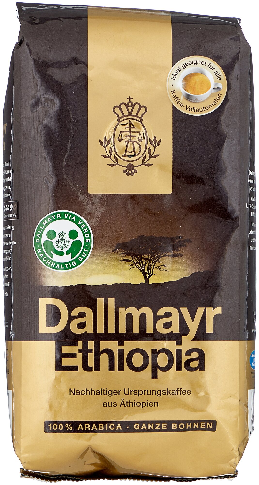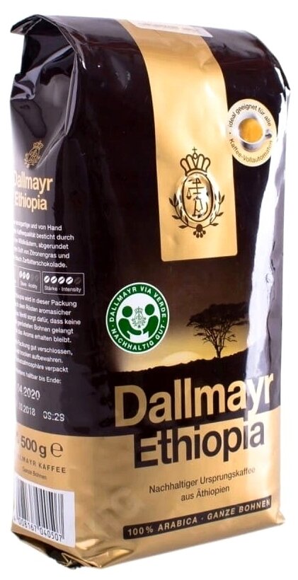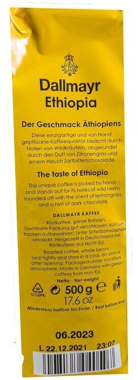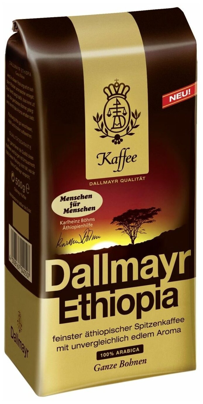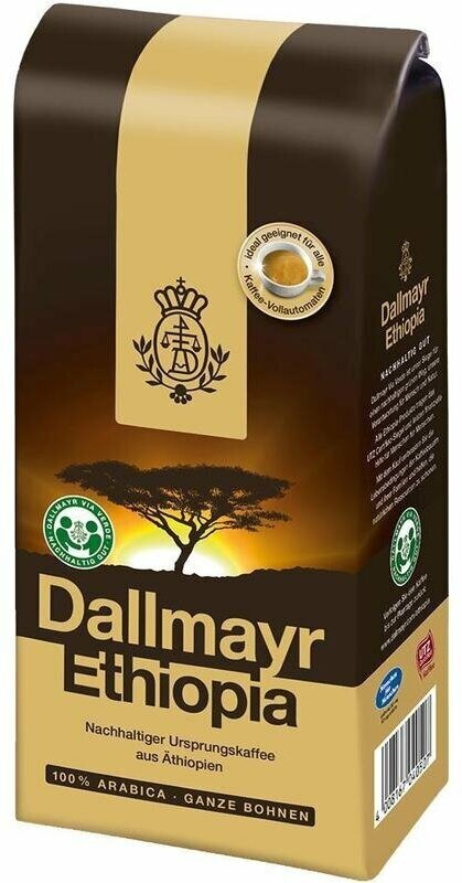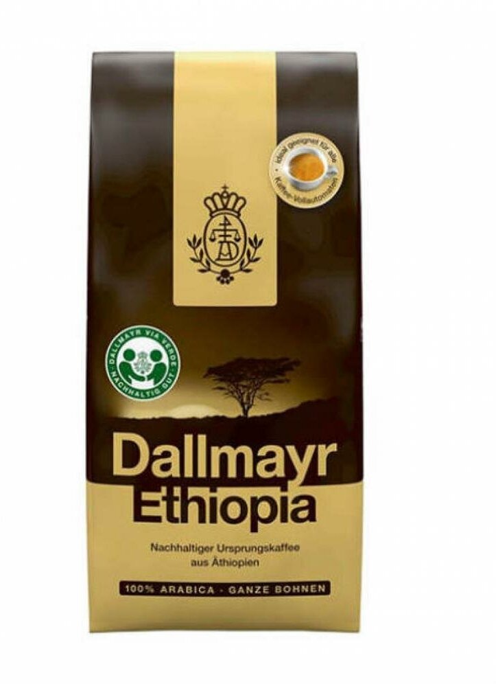 Кофе Dallmayr Ethiopia (Даллмайер Эфиопия) 500 гр – ухоженная, правильно-выращенная арабика прямиком из Эфиопии и легкая, золотистая обжарка придают напитку пряные нотки, томный аромат и деликатный вкус. Насыщенные кофейные масла обволакивают каждое зернышко, что дает напитку интенсивное и яркое послевкусие.