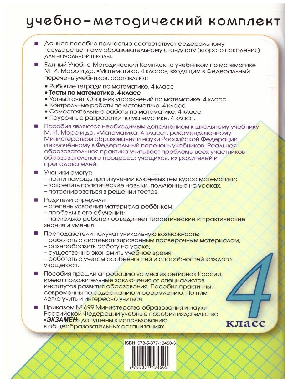 Сборник с тестами предназначен для тематического и итогового контроля знаний учащихся по основным разделам учебника "Математика. 4 класс" (авт. М. И. Моро и др.). Он может быть использован учителями, работающими и по другим комплектам, так как основные темы курсов совпадают.