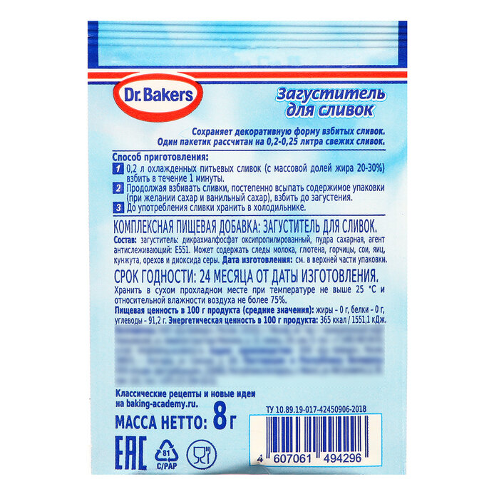 Если вы любите печь или готовить изысканные десерты, то загуститель для сливок Dr.Oetker 8г вы несомненно оцените по достоинству! Он помогает добиться плотной текстуры при взбивании и сохранить декоративную форму взбитого продукта. Один пакетик рассчитан на 200-250мл свежих сливок. Для взбивания рекомендуется использовать хорошо охлажденные сливки повышенной жирности (не ниже 20%, но лучше 33-35%). Перед украшением вашего торта или десерта переложите взбитые сливки в кондитерский мешок и отсадите на готовое изделие.