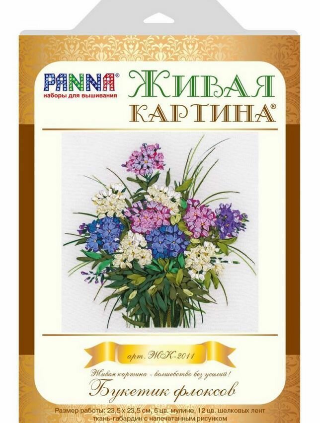 | Количество цветов | 6 мулине, 12 шелковых лент |