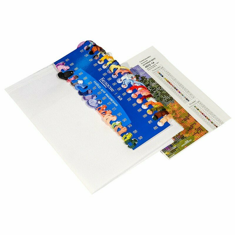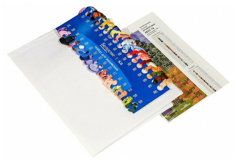 | В набор входит | хлопковая канва Aida 14 ct белого цвета, хлопковое мулине (46 цветов), разобранное на бумажном органайзере, 2 иглы, цветная символьная схема, инструкция по вышиванию. |