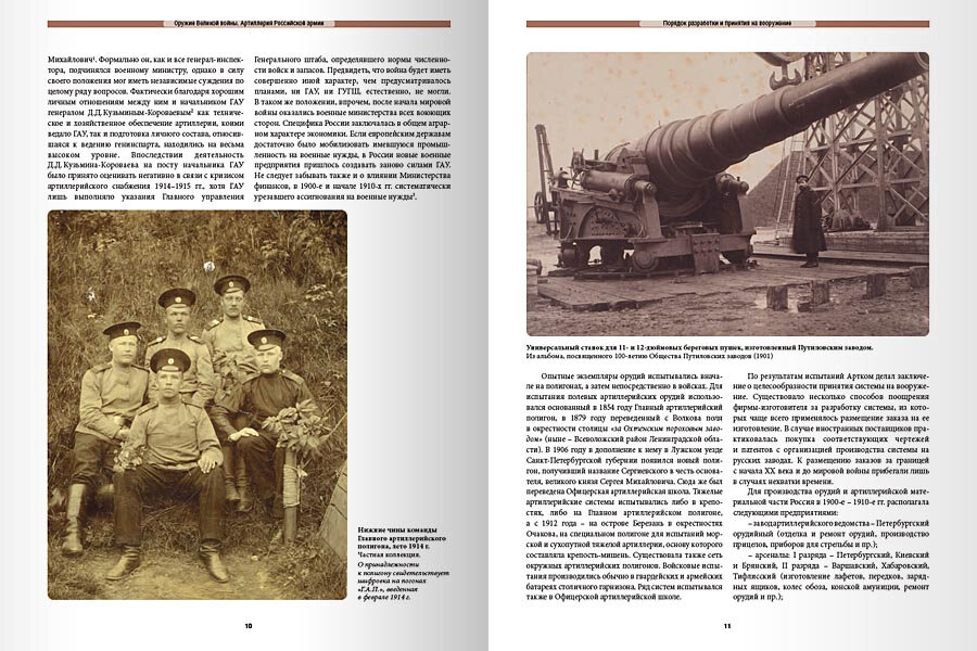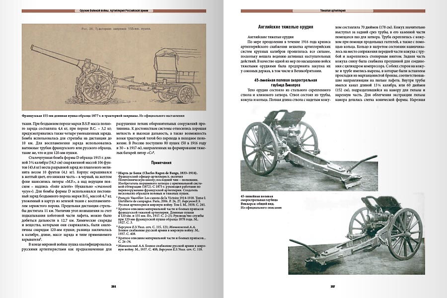 Отличный справочник - энциклопедия по русскому оружию первой мировой - орудиям, миномётам, бомбометам, отечественного и иностранного производства. На отличной же гладкой фотобумаге, с фотографиями оригинальных схем и инструкций, плюс естественно орудия в боевой обстановке или музеях, в том числе цветные. Для любителя истории оружия - вещь идеальная. Следует учесть, что формат у издания превышает альбомный лист, то есть фотографии немаленькие, пусть и не всегда чёткие.