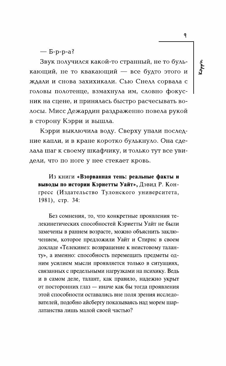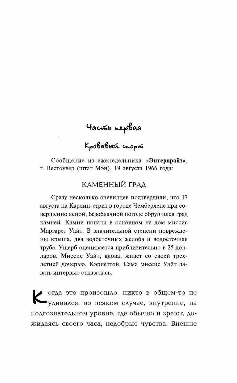 Маленький провинциальный городок в Новой Англии в одночасье становится «мертвым городом». На улицах лежат трупы, над домами бушует смертоносное пламя. И весь этот кошмар огненного Апокалип-сиса — дело рук одного человека, девушки Кэрри, жалкой, запуганной дочери чудаковатой вдовы. Долгие годы дремал в Кэрри талант теле-кинеза, чтобы однажды проснуться.