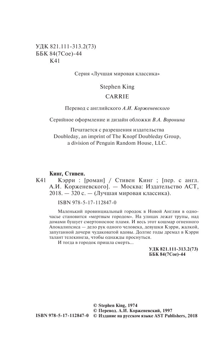 Книга: Кэрри (Кинг Стивен , Корженевский Александр Игоревич (переводчик)); АСТ, 2018