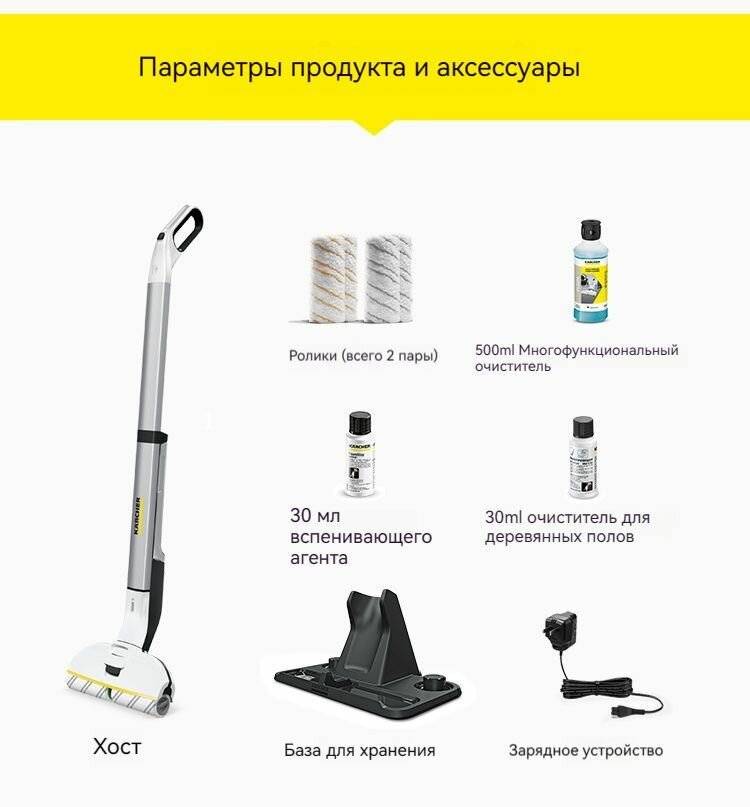 | Прочие особенности и свойства | Непрерывная уборка с чистой водой? Аппарат для влажной уборки FC 3 Cordless с инновационной функцией самоочистки делает это возможным - попрощайтесь с обычной шваброй для пола. К вращающимся роликам постоянно подается чистая вода, в то время, как грязь собирается в резервуаре для грязной воды. Аппарат позволяет помыть полы на 20% чище по сравнению с обычными швабрами. Аппарат FC 3 Cordless Premium с тонким дизайном идеален для мытья полов под мебелью и удобен при хранении. Гибкое шарнирное соединение позволяет легко мыть пол в углах и по краям. По полам можно ходить уже через две минуты после уборки. Это означает, что данным аппаратом можно помыть даже паркет. Мощная литий-ионная батарея обеспечивает максимальную свободу движения, поскольку во время уборки Вы больше не привязаны к источнику питания. Интуитивно понятный ЖК-дисплей постоянно отображает актуальный уровень заряда батареи. Аппарат FC 3 Cordless Premium достигает до 20% более высокого уровня производительности по сравнению с обычными швабрами с матерчатыми насадками( по результатам проведения тестов по очистке; оценивались эффективность очистки, склонность к загрязнению и удобство очистки краев поверхностей) Производительность от одного заряда аккумулятора (м2) 60 Объем бака для чистой воды (мл) 360 Объем бака для грязной воды (мл) 140 Скорость вращения ролика (об/мин) 500 Рабочая ширина ролика (мм) 300 Время высыхания после уборки (мин) 2 Напряжение аккумулятора (В) 7,2 Время работы аккумулятора (мин) 20 Время заряда аккумулятора (h) 4 Оснащение Система с 2 баками Пара универсальных роликовых падов, желтые Универсальное чистящее средство для пола RM 536 (30 мл) Парковочная станция с местом для хранения роликов Зарядное устройство |