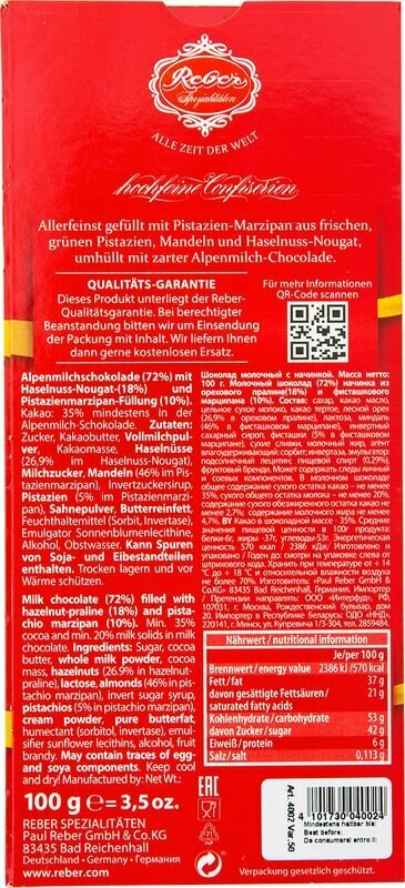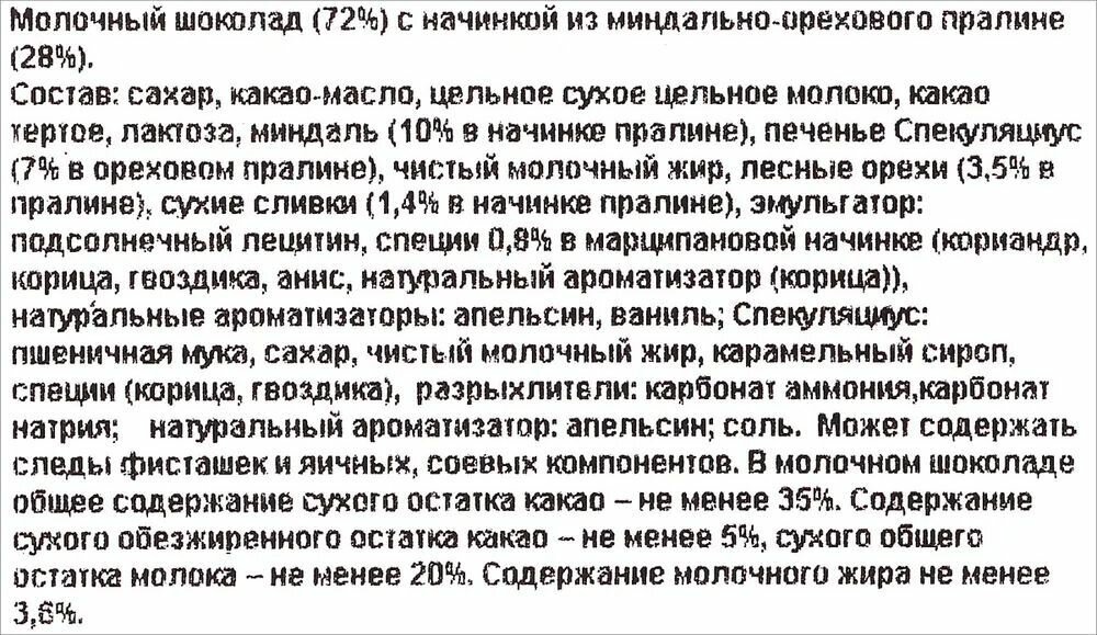| Состав | сахар, какао-масло, цельное сухое молоко, какао тертое, лесные орехи (27% в ореховом пралине), лактоза, миндаль (29% в фисташковом марципане), инвертный сахарный сироп, фисташки (3% в фисташковом марципане), сухие сливки, молочный жир, агент влагоудерживающий |