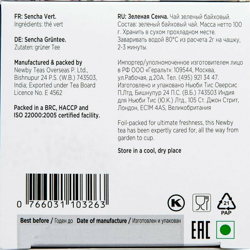 Чай зеленый Newby Green Sencha 100г — высококачественный чай для истинных ценителей ароматного напитка! Сенча — традиционный японский сорт чая, невероятно популярный во всем мире. Для изготовления этой сенчи используются молодые чайные листья, бережно собранные ранней весной. После сбора листочки обрабатываются в традиционном японской стиле — с помощью пара — и скручиваются в аккуратные трубочки, которые при заваривании дают характерный нежный вкус и свежий аромат. Данный сорт чая считается одним из самых полезных: он является превосходным антиоксидантом, предотвращающим сердечно-сосудистые заболевания, источником витаминов и аминокислот. Сенча прекрасно бодрит, при этом в ее составе содержится меньше кофеина и танина, чем в других чаях. Чай рекомендуется заваривать не более 1.5 минут в мягкой воде температурой около 80 градусов.