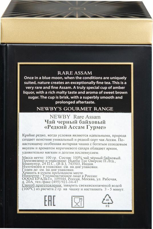 Чай черный Newby Rare Assam 100г — поистине уникальный и редкий сорт индийского чая, собранный при самых благоприятных условиях на чайный плантациях долины Брахмапутры штата Ассам на северо-востоке Индии. Затяжные муссонные дожди и экстремальные перепады температур, свойственные этому региону, рождают очень благородный напиток с насыщенным солодовым вкусом и сладким ароматом коричневого сахара. Послевкусие этого сорта длится очень долго и доставляет настоящее удовольствие чайным эстетам. Его листья крупные и тонкие, при заварке они дают солнечно-янтарный цвет. Чай хранится в презентабельной и стильной жестяной банке, которая является достойной упаковкой к эксклюзивному и дорогому продукту.