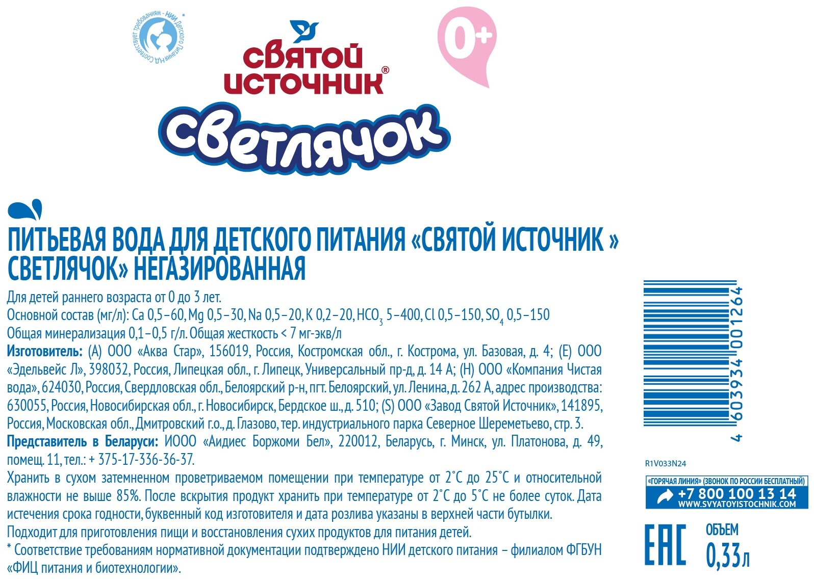 Описание товара:Детская вода с первого дня жизни. Нормативная документация, по которой производится Святой Источник «Светлячок», соответствует требованиям НИИ Детского питания. Вода подходит для детей с первых дней жизни. Не требует кипячения Вода соответствует требования к показателям микробиологической безопасности, поэтому она абсолютно безопасна для детского организма. Подходит для приготовления детского питания. Вода растворяет молочную смесь и кашу, не нарушая полезного состава.Состав товара:Минерализация: 0,1-0,45 г/л. Содержание основных ионов мг/л: кальций < 5-50, магний <2-25, натрий 0,5-20, калий <0,2-20, гидрокарбонаты <15-175, хлориды <5-90, сульфаты <0,5-25. Общая жесткость < 5 мг экв/л.Меры предосторожности:Хранить в сухом, затемненном, проветриваемом помещении и относительной влажности не выше 85%.