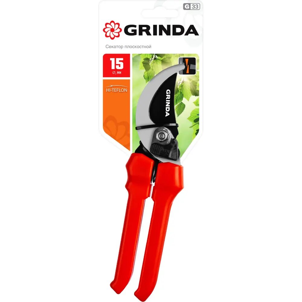 Секатор Grinda применяется при работе на садовых и дачных участках для обрезания побегов и небольших веток с диаметром до 15 мм. Инструмент состоит из острозаточенных лезвий из закаленной углеродистой стали с тефлоновым покрытием, и пластиковых рукояток. Материалы изготовления инструмента обеспечивают удобное и эффективное использование, а также длительный срок службы.