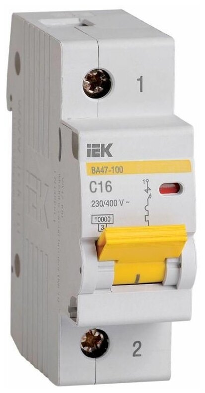 IEK ВА47-100 Автомат 1Р 100А (С) 10kA Автоматический выключатель 1P 100 A C 10kA IEK ВА47-100 предназначен для защиты распределительных и групповых цепей, имеющих активную и индуктивную нагрузки. Рекомендуются к применению во вводно-распределительных устройствах бытовых и промышленных электроустановок. Насечки на контактных зажимах снижают тепловые потери и увеличивают механическую устойчивость соединения. Эргономичный дизайн рукоятки включения/выключения облегчает процесс коммутации.