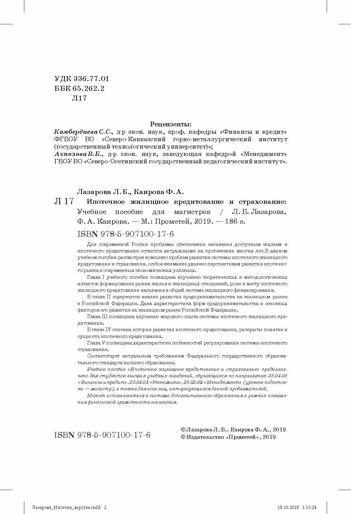Ипотечное жилищное кредитование и страхование. Учебное пособие для магистров (Лазарова Лариса Борисовна, Каирова Фатима Асламбековна); Прометей, 2019