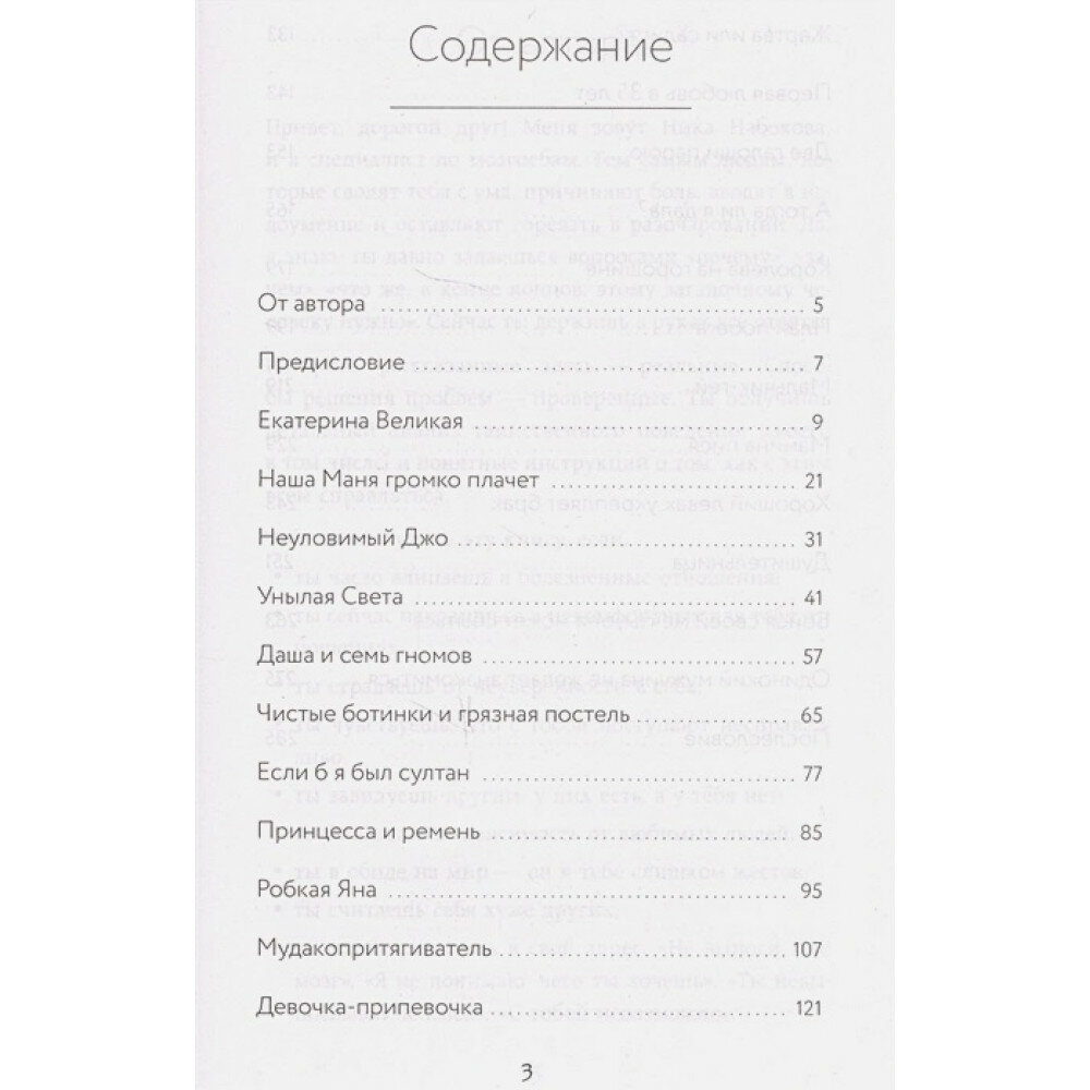От книги не стоит ожидать глубокого психоанализа, она построена в виде историй из жизни, основанных на реальных примерах экземпляров, которые встречаются в жизни каждого из нас, с описанием патогенеза поведения и что же желать, если либо в Вас проявляются эти грешки, либо в Вашем окружении есть люди, которые так нехило отправляют жизнь. Ника говорит всё в лоб, не обещая счастливую жизнь, плывя по течению и не даёт советов, как же сделать так, чтобы стать счастливым чужими руками. Всё очень метко и по делу.