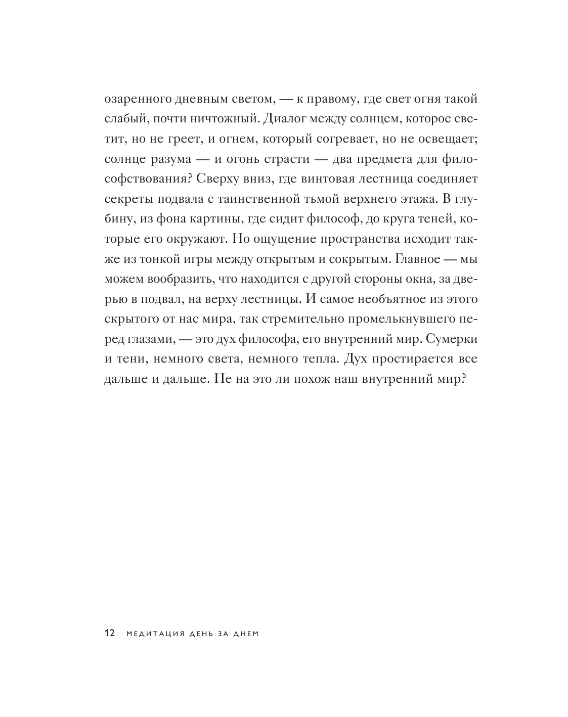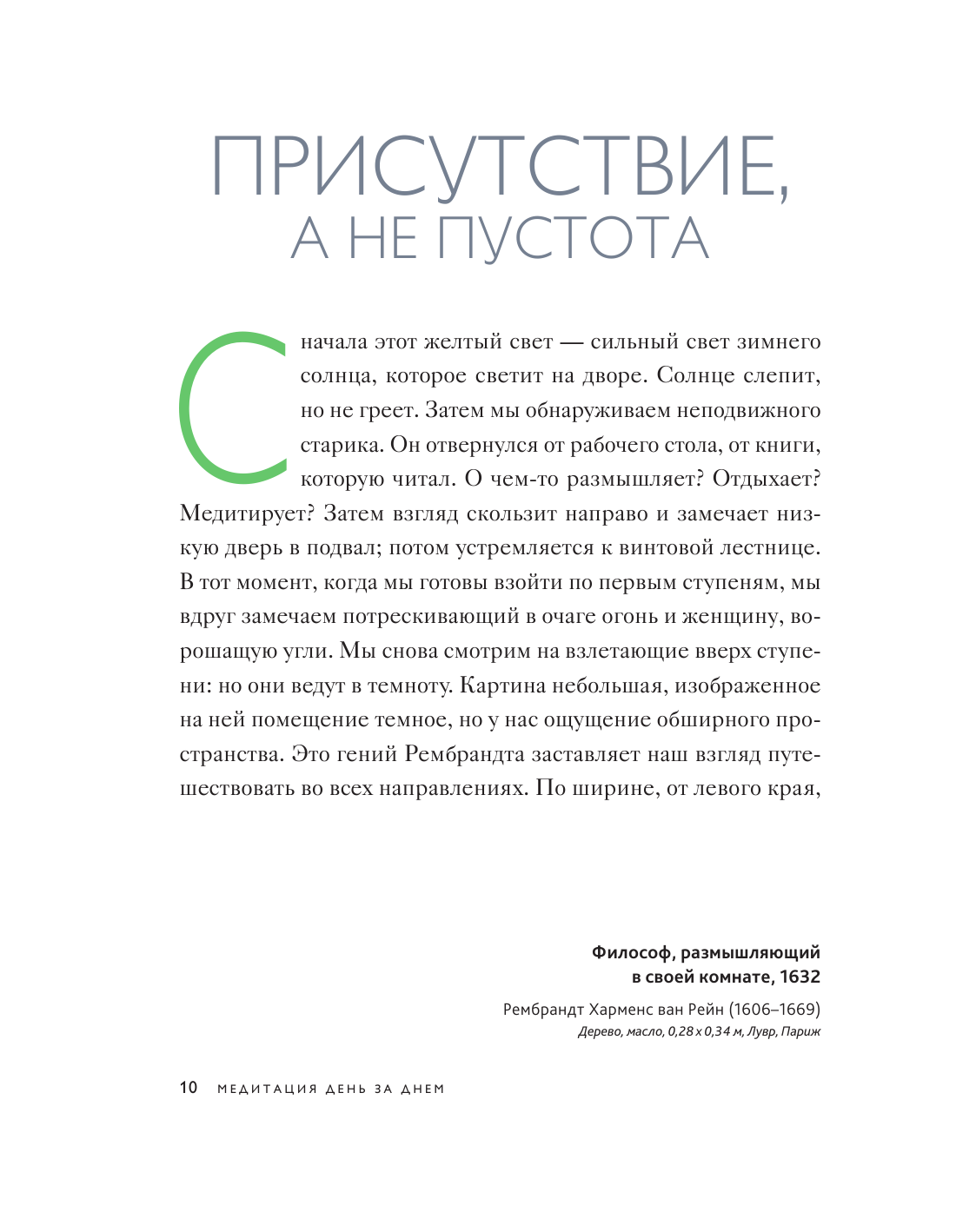 Открыв эту подарочную книгу, вы сразу же почувствуете, что вам предстоит волнительное и прекрасное путешествие! Автор книги Кристоф Андре работает психотерапевтом в Медицинском центре St. Anne в Париже и с помощью уникальной практики, созданной им самим, помогает людям избавиться от страданий, направляя их жизнь в чистое и мощное русло. Используя дыхание, тело и сознание настоящего момента, вы не только обретете эмоциональное спокойствие и уверенность в своих действиях, но и сможете контролировать неуправляемые жизненные ситуации и забудете о потоке негативных мыслей. Главная же фишка заключается в том, что медитировать вы будете на... картины великих художников — вы видели их много раз, но еще не раскрыли до конца их тайну. Если вы только начинаете практиковать, эти упражнения, станут началом для дальнейшего развития. Если вы уже умеете медитировать, то получите возможностью освежить вашу практику и отличную мотивацию для ее того, чтобы использовать ее каждый день.