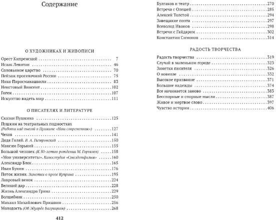 В сборник вошло несколько небольших повестей о художниках (Кипренском, Левитане, Ван Гоге, Пиросмани), статьи о наследии Пушкина, Чехова, Бунина, воспоминания о встречах с замечательными писателями-современниками (Горьким, Булгаковым, Симоновым и многими другими), а также заметки, размышления К. Г. Паустовского о различных аспектах литературного творчества.